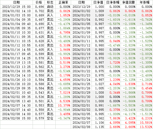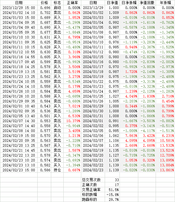 本周净值涨幅4.30%,国防ETF周涨幅3.91%,本周跑赢标的0.39%,年净值涨幅20.038%,年跑赢标的36.1%。按照系统,应该是15日10:15买入0.573元,16日9:35卖出0.57元,17日9:55日买入0.567元,18日14:50卖出0.578元,19日10:40买入0.583元。到周五收盘全周盈利0.008元,收益率1.4%,和你的收益差距很大,是什么原因?