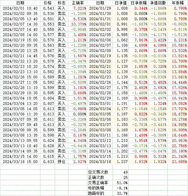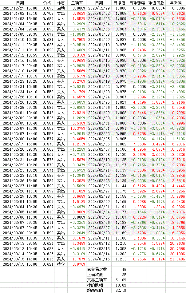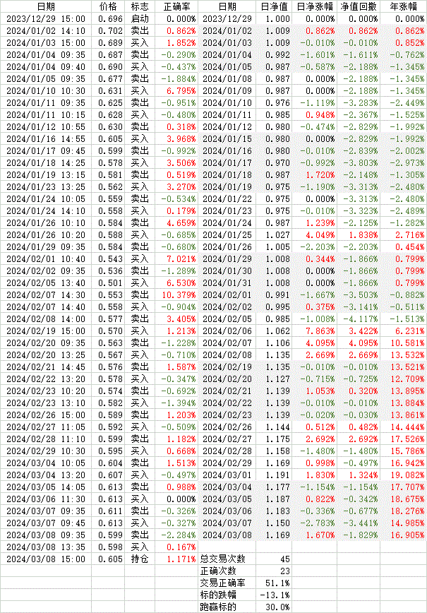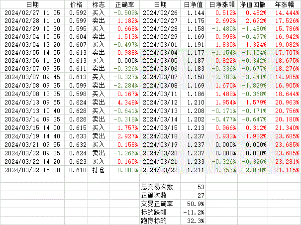 今天卖出,楼主在表格中能不能列出每一次买卖的收益率呢?不知道正确率是什么意思?你说的收益率就是表格中的正确率,如果买入价格低,卖出价格高,收益率为正,如果买入价格高,卖出价格低,收益率为负,这个收益好理解,但还存在另一种情况,卖出后,可能以更低的价格买回,那么这个操作是正确的,但这个操作并不产生收益,只是没增加损失,所以,我就取个名字叫正确率,正确率表示做对了,做对了,可能会增加收益,也可能会不增加损失。