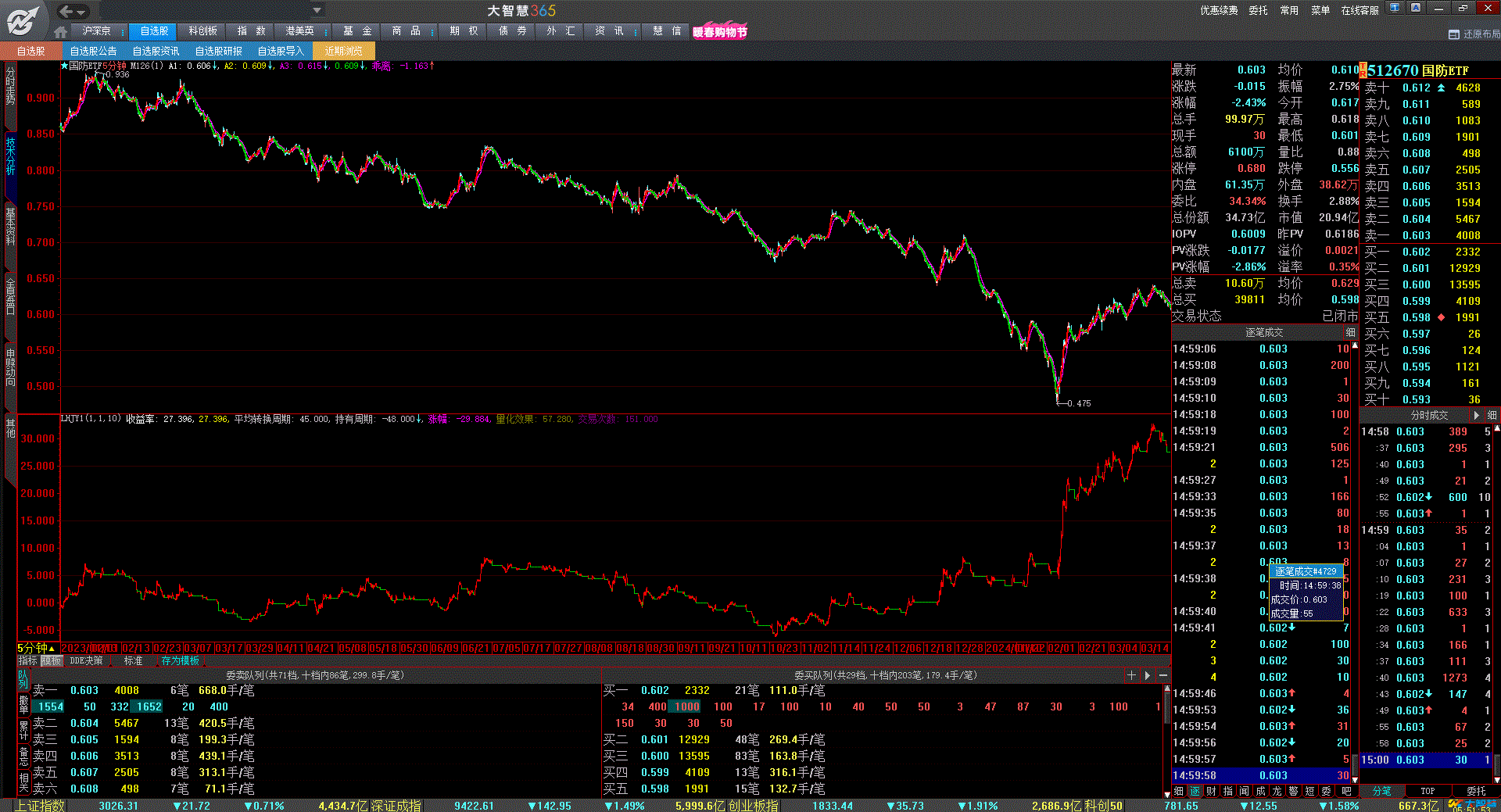 2. 你用的行情软件和目前券商通用的行情软件的价格不一样,我用的通达信和大智慧,大智慧和通达信软件15日10:15的价格都是0.570,可以参看截图。还有2024/04/18 的行情软件14:55DIFF转负,以0.576卖出,而不是在14:50以0.578卖出,再有2024/04/19 10:40,我用的两个行情软件都是0.582,为什么你的又是不一样,是0.583?
