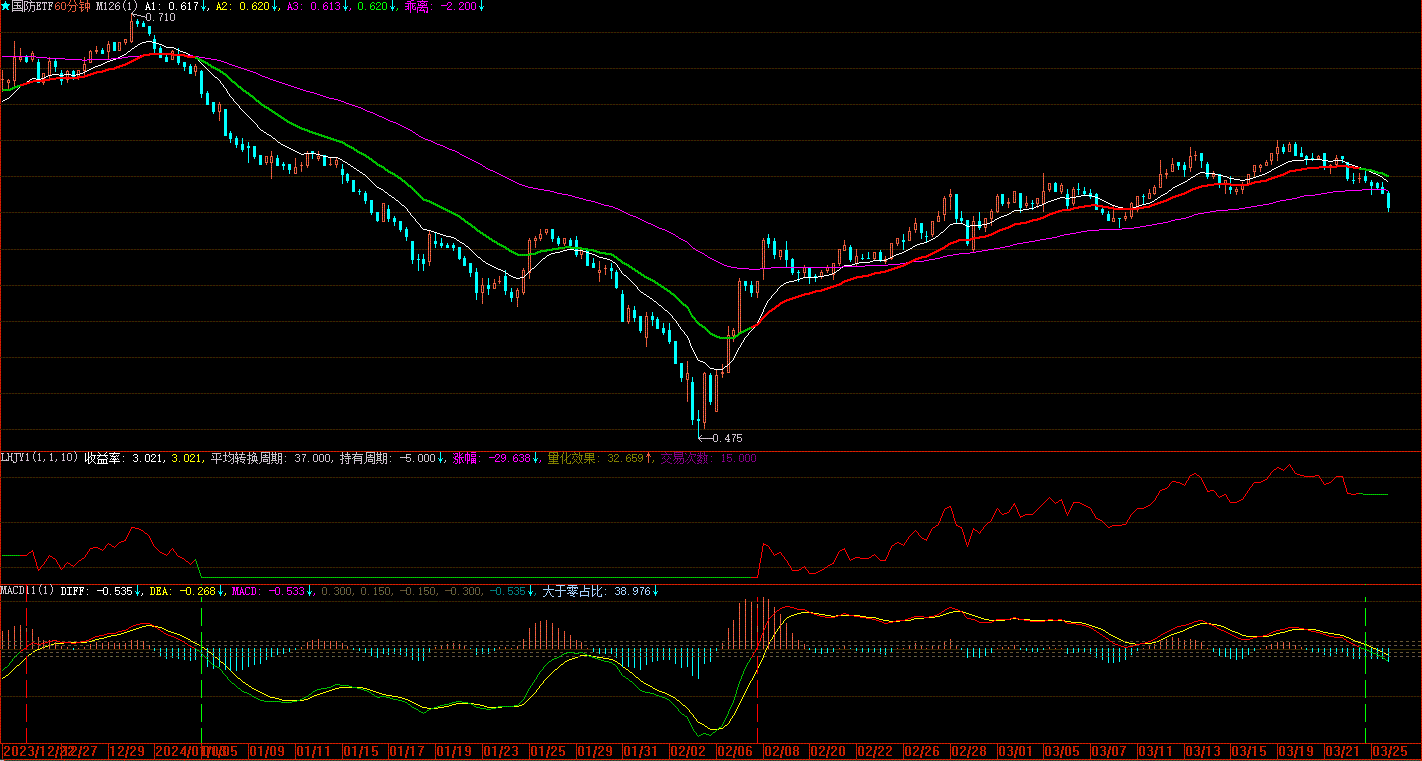 4年时间可以获得了约100%的超额收益,效果明显,今年继续实盘跟踪MACD公式操作,只要国防ETF今年能出现几次明显的下跌或明显的上涨,就能获取超额的收益,还不错,今年开年就出现了明显的下跌了,已经获得了近10%的超额收益了。