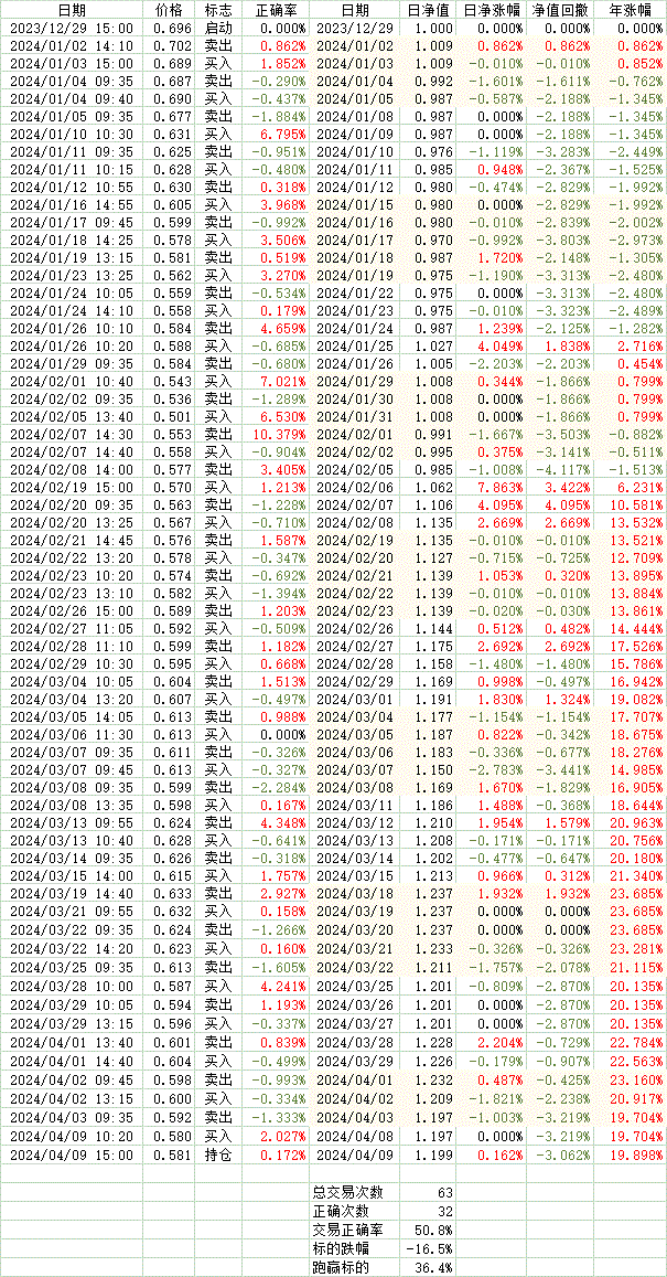 比如今天上午9:40,DIFF转负了,交易系统指示以0.573的价格卖出,但下午14:45,DIFF又转正了,交易系统指示,以0.569买回,所以,上午9:40的卖出是正确的,做成了0.4分的差价,但今天的价格跌了1.2分,所以今天的净值是减少的,相对于昨天,收益率还是负的。