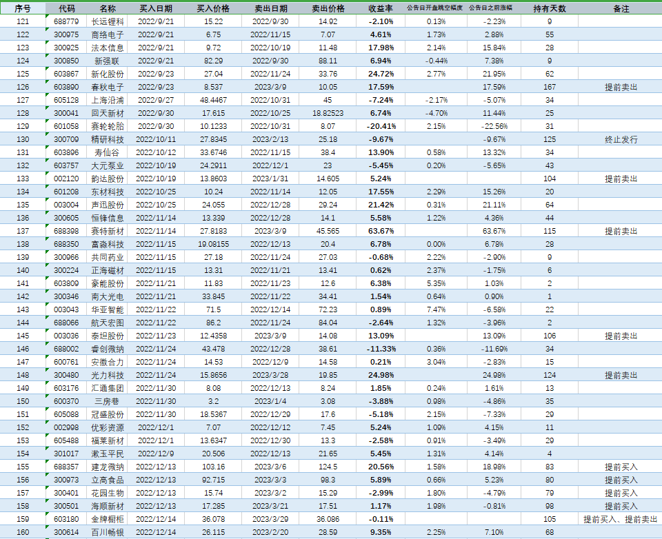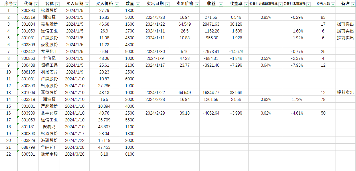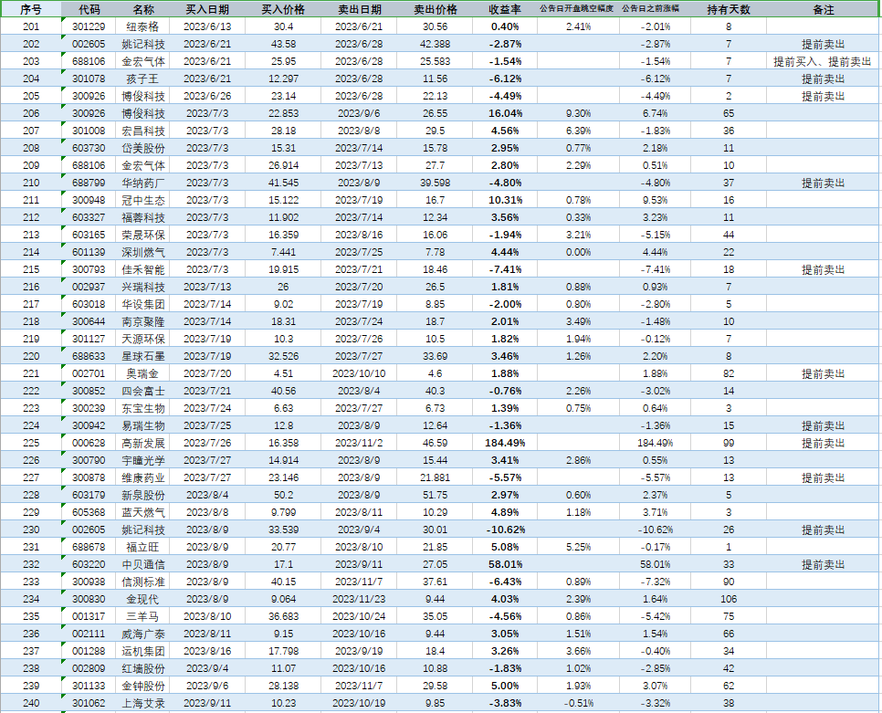 两年来共完成交易251笔,胜率62.5%,每笔持仓约占总资金的8~10%,平均每笔收益率3.18%,其中公告日开盘平均高开1.68%,公告日之前持仓的平均收益率1.5%。可见套利与提前埋伏贡献的收益大致相当。