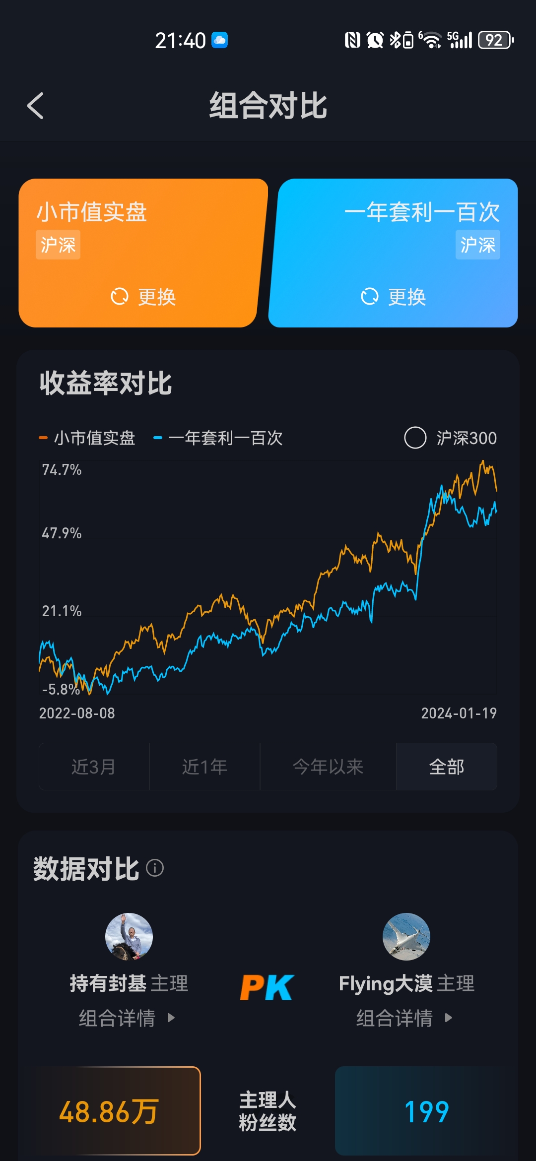 当然,比较一下还是有意义的,持有封基老师有一个小市值策略的雪球组合一直在更新,是很好的实例。感谢持有封基老师的分享,在此我们比较两种策略的收益曲线: