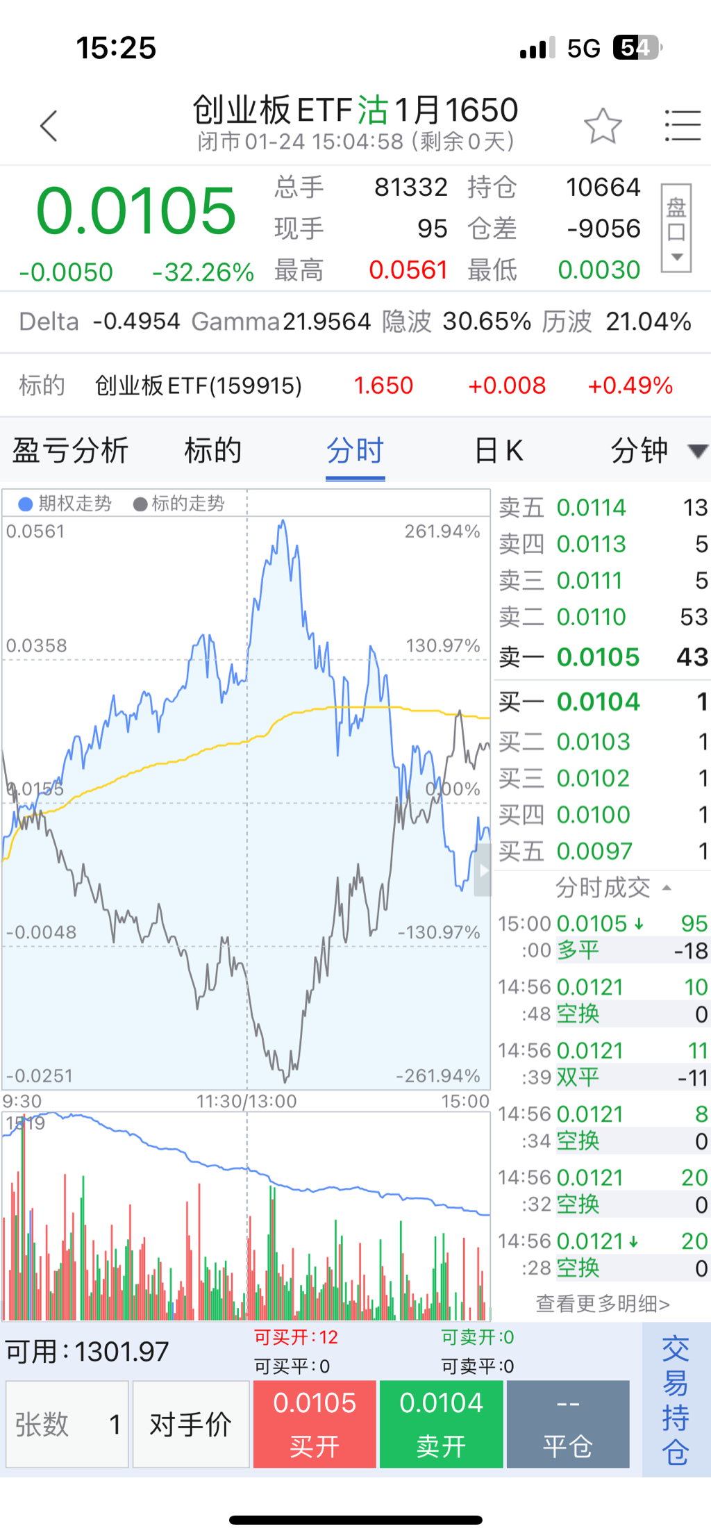 确实挺有意思的一个问题有一个猜想的解释,大资金拿着创业板etf的想出货,如果现货直接出可能砸盘,不如直接衍生市场出货,大概0.6%的摩擦成本吧还有一种,下午1:20前后,卖沽博反弹,收盘时不想接货/没钱接货,强行平仓,结果点差比较大,不过也赚了400块,可以接受确实有这个可能我以前以为有些人只是怕被行权指派要麻烦操作几天就多给个几天利息钱 没想到会多这么多