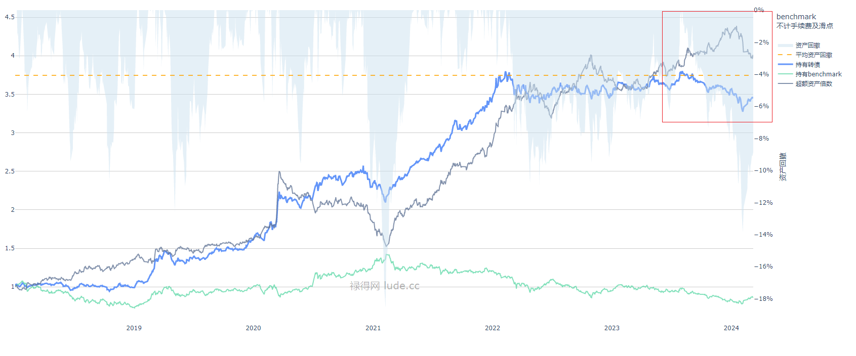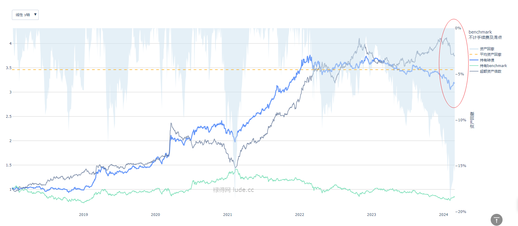 蓝色线是传统双低策略的回测曲线,灰色线是相对于沪深300的超额收益。