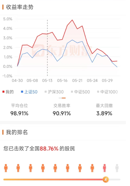 四月前半个月基本是在盈亏线上挣扎,月中出现一定幅度的回撤,但是很快就收复。四月基本践行了三月的观点,继续加仓,随着部分标的分红,仓位有所下降,本来准备五月继续接回来的,但是看着五一假期的新闻,估计短时间接回来的可能性比较小。