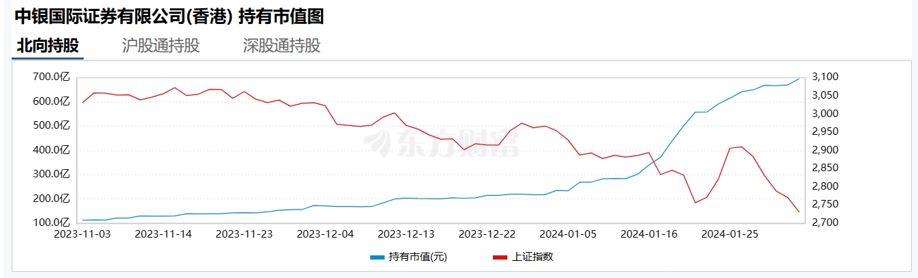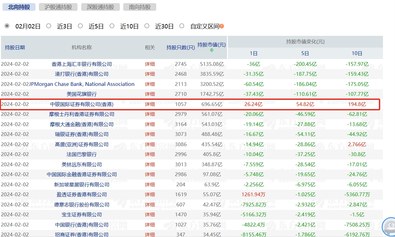 几周前传闻2万亿平准基金通过北向买A股,中银国际证券有限公司(香港) 持有市值持续在增持,目前持有市值规模到700亿了,增持了大概有几百亿,其它机构因为股价下跌和卖出减持,持仓金额都在下降。