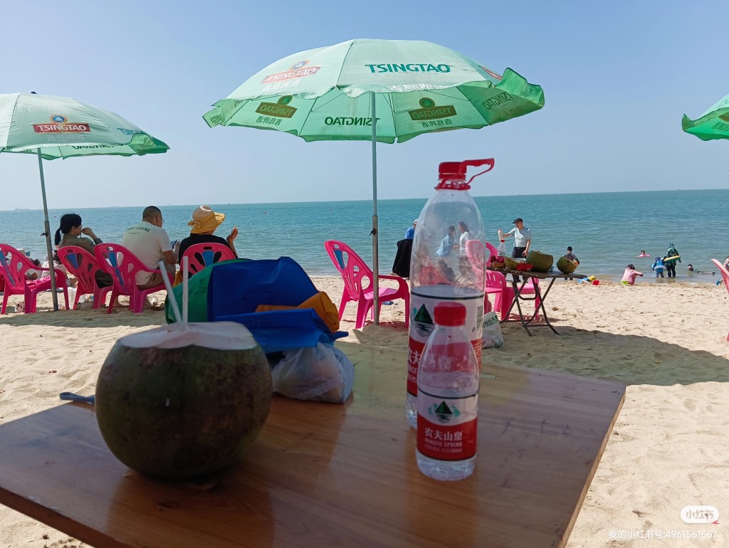 踩在金色细腻的沙滩上,要了一个椰子,静坐在红色的座椅上,远眺蓝天白云还有青绿色的天际线;近观青灰色的海面波光粼粼、白浪不停地拍击海岸!岸边游人很少,大约昨天的游客正各显神通奔赴家乡!此刻,身边很静,静的只有浪涛声!夫人今天没有下海,她边走边与家乡的妈妈视频电话(2边的妈妈都没有见过实地的大海)……