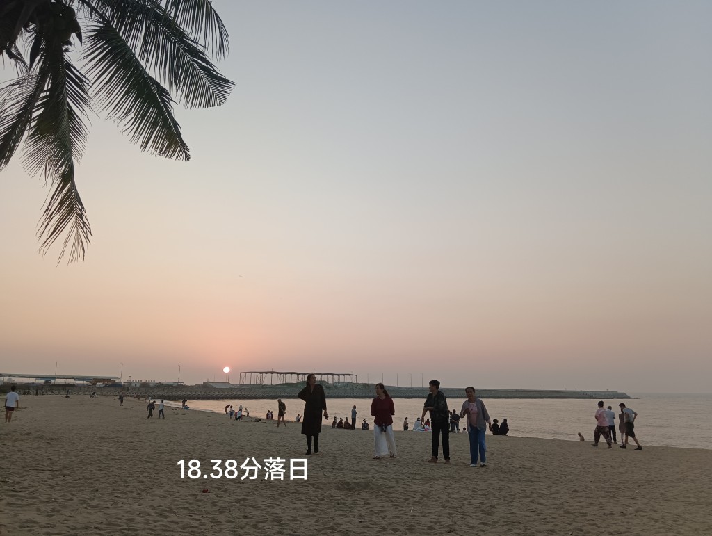 太阳一寸一寸地降落,夕阳很美!可是眼前长长的人工海堤破坏了落日的余晖!海天被无聊的割裂,很不协调!