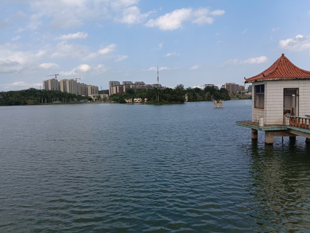 沿着石砌的平台往公园中心走去,大约100米左右便到公园中心!一池清水,湖边零星有几个游人在树荫下歇息。湖面不大,四周小道也算整齐(不比苏州园林那么精致),与城市配套基本匹配。湖对面是一所小学,这是这座小城的未来之一,或许这里未来会走出更多的儋州的骄傲!