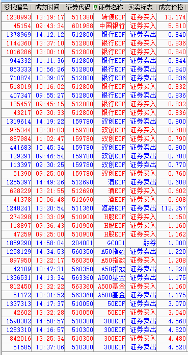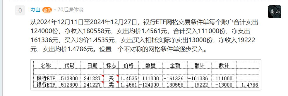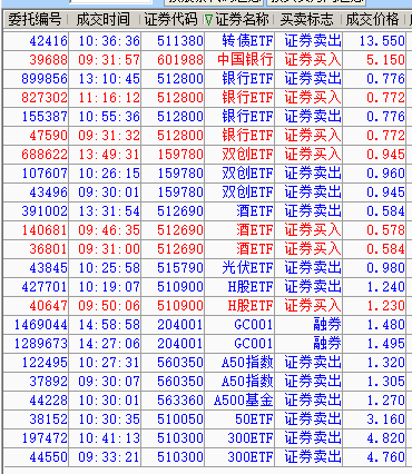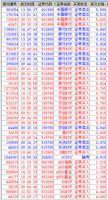 我是一个七十多岁的老人,证券交易主要靠智能条件单自动成交。我在银河证券的一个账户设置的条件单,大多数是网格交易,也又一些定价卖出和定价买入等。两年多来个人感觉还不错,发个成交记录的帖子,希望得到集友的帮助和指教。成交记录绝大多数是智能条件单自动成交,也会有少数是手动委托成交的。帖子的标题就改为智能条件单的成交记录吧。有成交时争取每天发贴,如果万一成交笔数较多,就至少发一个成交标的完整记录,优先发512800银行ETF的成交记录。因为512800银行ETF的持仓市值约占这个账户的百分之四十,另外这个帖子最初的标题是512800银行ETF的网格交易,而且自2024年2月5日发贴以来的大多数回复都是512800银行ETF的成交记录。