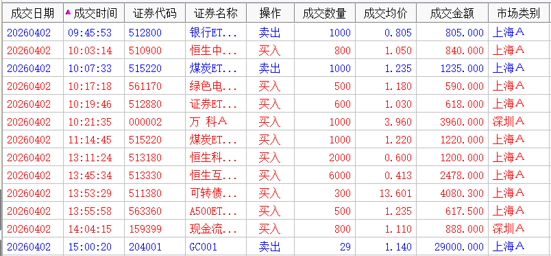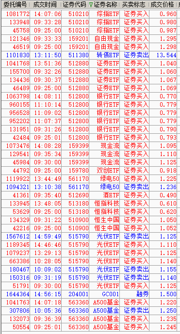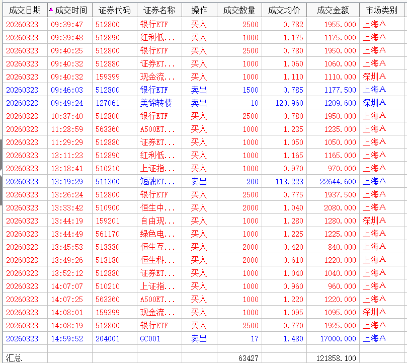 网格交易就是这样啊,不管天是不是塌下来。。。程序化交易,该买就买,这是交易计划。。。今天买到资金耗尽,临时银证转账2次,崩溃啊。。。心里还是很慌的。今天资金快耗尽时,两次共卖出4.5万的511360短融ETF,收市时只剩1.7万。