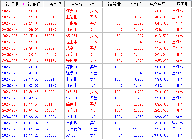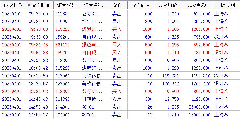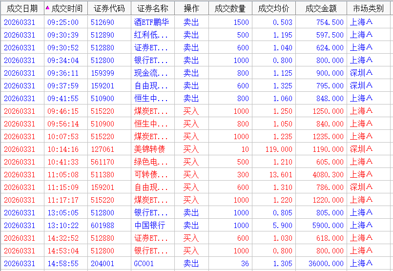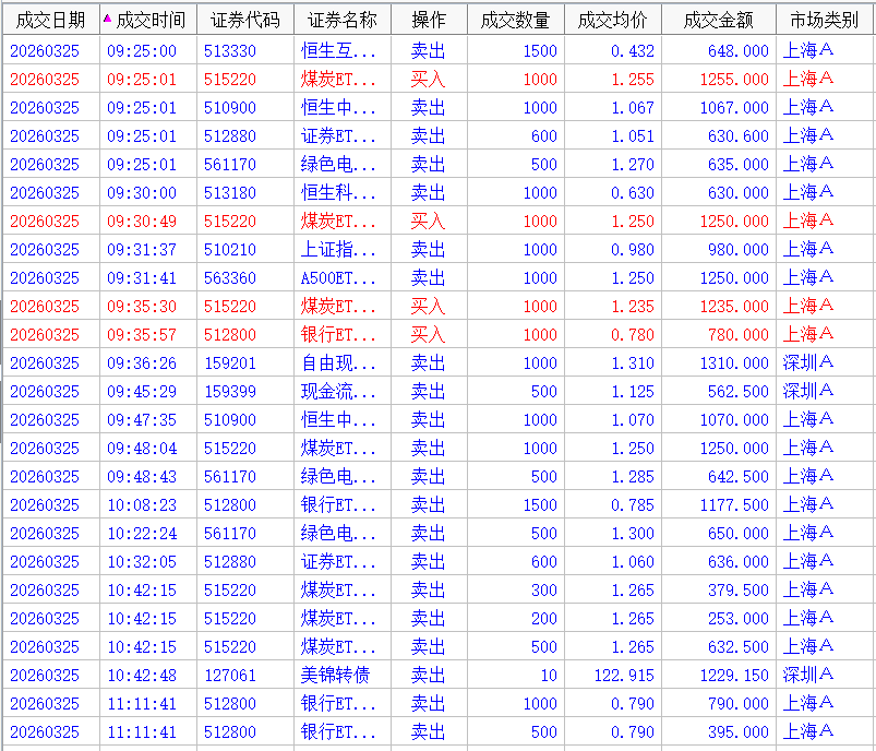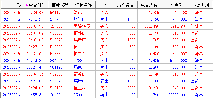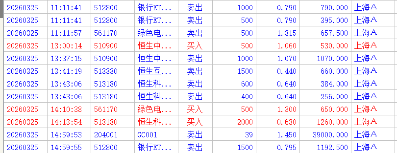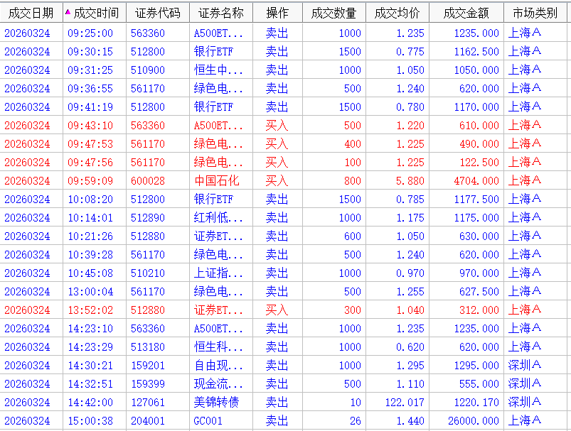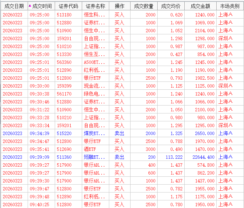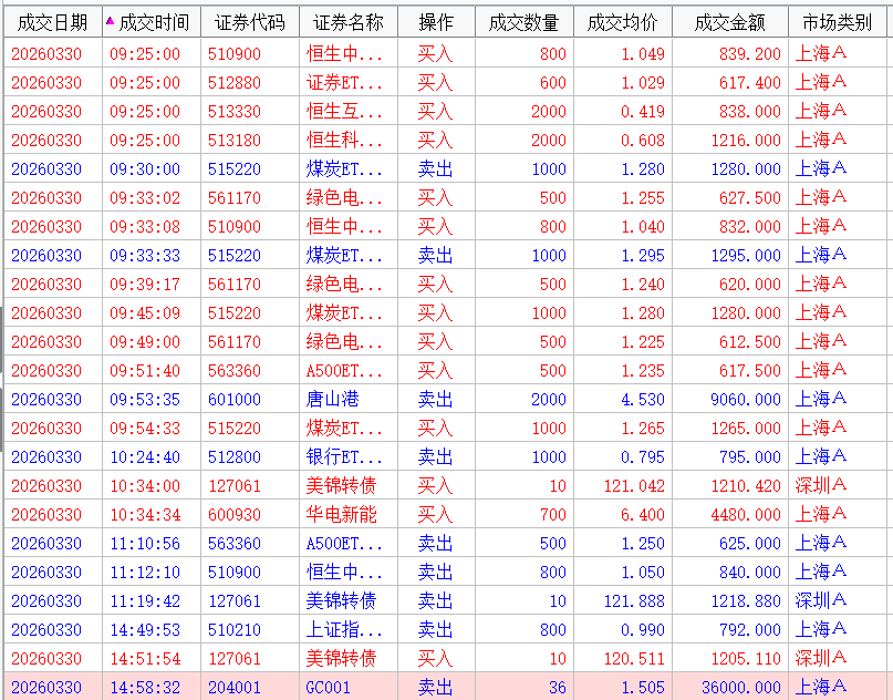 2026年3月25日华泰证券成交记录按成交时间排序我也是银河的;我是低波品种用成交驱动;其他用到价触发的;然后都是等比网格不是价差网格。不知道是否合理?努力做低成本中。。。目前只有2个红,另外4个都绿色了。我发现如果一个标的在成本线下方,买一份,成本价格会下降,但对称卖一份成本价又上去一些了,难道的成本线下方应该少卖吗?一般理论都说忘记成本,不应该考虑成本决策交易,对吗?