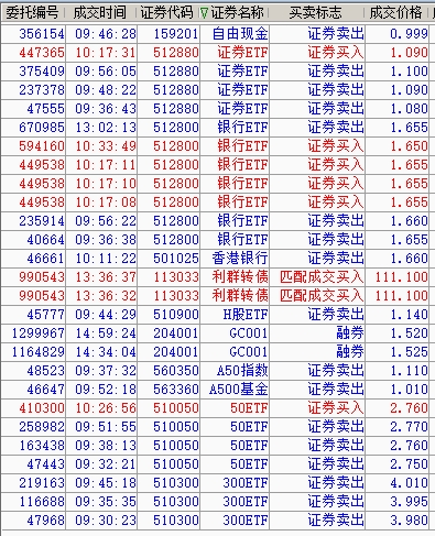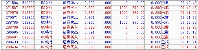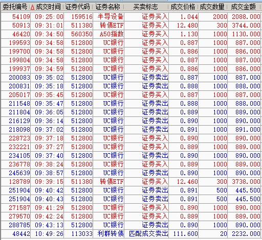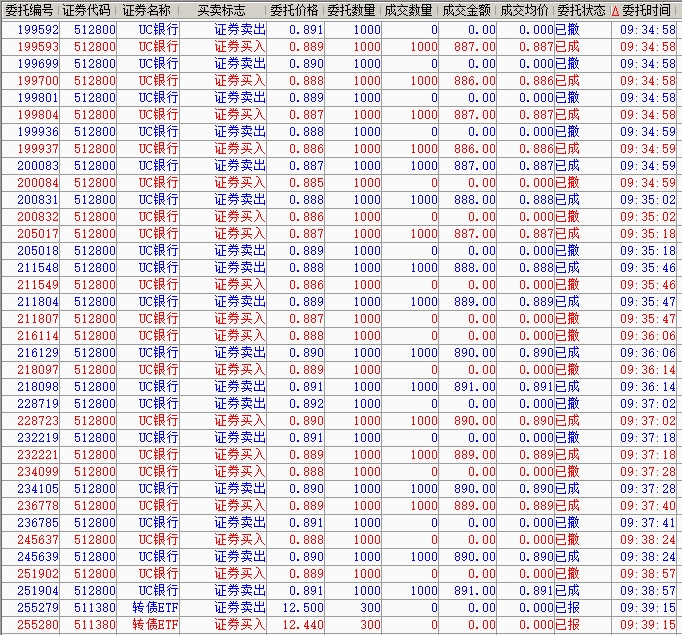 512800银行ETF今天拆分,需要重新设置网格条件单,我的另一个银河证券账户在设置时,把网格的间隔错设置为0.001元(应该时0.01元,因为这个账户持仓较少)无意中实验了8分钟最小的网格间隔。从委托情况和成交情况来看,银河证券成交驱动型网格条件单的效率还是很高的。
