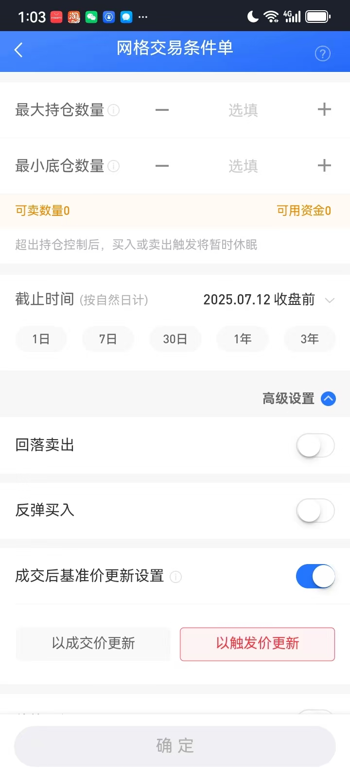 您好,请教个问题,望不吝赐教。这两年银行ETF涨幅比较大,我看您的网格设置为0.005,这么小的网格,一波大幅上涨会不会把您的基础仓位都清空了?您是如何保持基础仓位的?是中间补仓基础了吗?买入和卖出数量的设置是可以不对称的,近一年512800银行ETF的持仓也减少了约38%,因持仓较多不会清空。