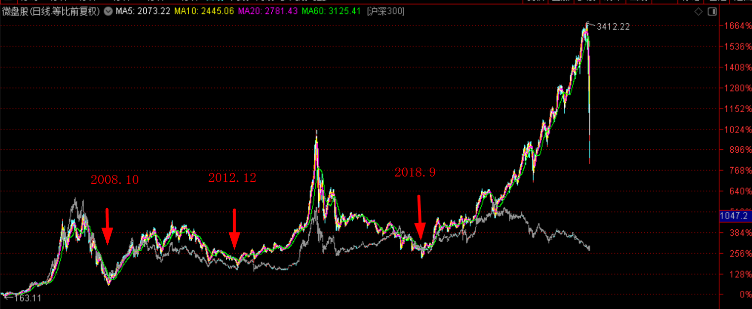 1.前段行情表明了白马股、大盘股行情的来临,也宣布了小盘股、微盘股行情的结束,从过往历史可以看出,行情总是在大盘和小盘之间轮动。