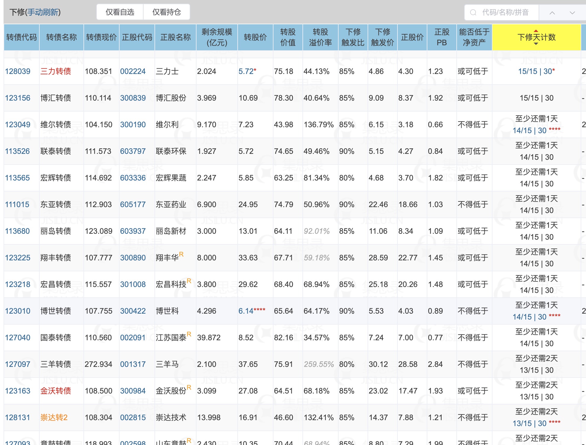 明天猜三个转债提下修,博世转债,宏昌转债,东亚转债,维尔转债也有可能下修或者两个月不下修。博世快到期了,已经下修四次,再冲一把,不能学岭南开摆;宏昌和东亚刚进入转股期,修一下卖个高点的价格。感悟:赌临期下修的概率会比较高,但要排除有面退风险的,例如最近的山鹰,岭南,在1.X元的生死关头面前公司会选择不下修先保命。。。。博世股价4元有一定的下修概率,但最多只能下修到转股价值94元(PB限制),即便下修油水不多,如果下修失败有可能跌1元,盈亏比不是太好。。。打算采取冲高获利了结的策略。