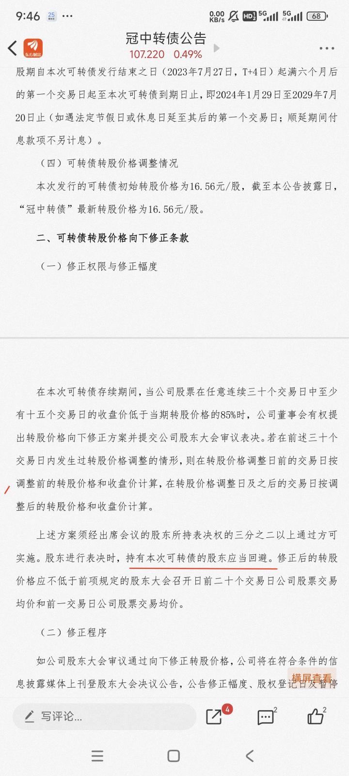 1. 大股东及一致行动人,有两位清仓式减持冠中转债,占比达到10%。他们是想拉高出货还是为了获得了股东大会下修转股价的投票权呢?如果他们想趁利好拉高出货吗?我们看看股价的近期表现:正股从低点反弹了45%左右,而转债只反弹了7%左右。这表明两位大股东清仓可转债并不是为了拉高出货而进行的操作。出售可转债很显然是为了获得投票权。