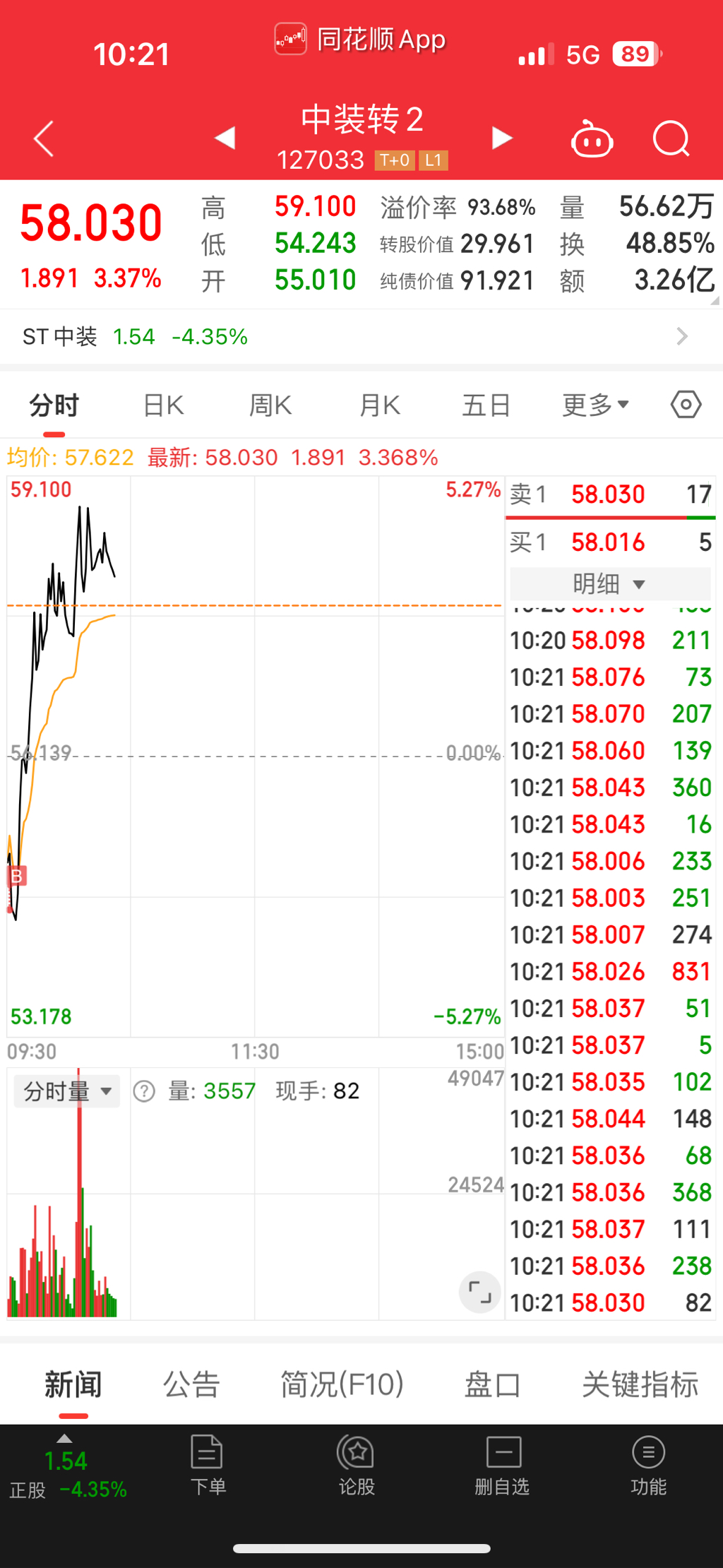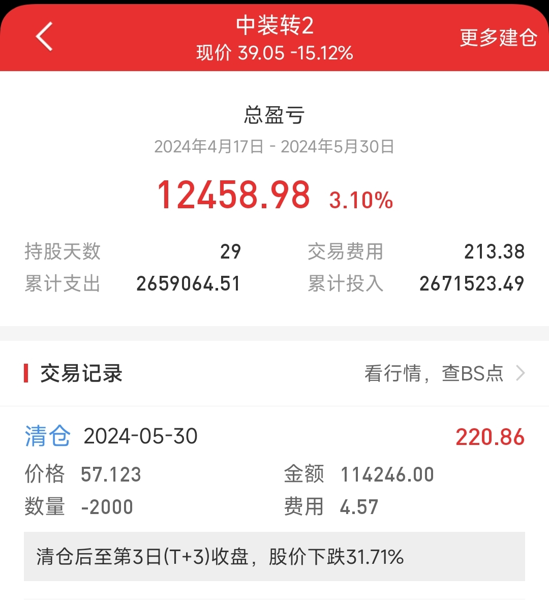 周五刚割了1万张,66的本,61卖了,这货从第一次20cm下跌买入6000张,中间T了几次,包括80出了一半,后来越买越跌,从盈利15%到亏10%,实在是心里承受不住了。你这个接近最低位清仓,我大概就是在这个时候进入,大盘疲软,觉得这个可以尝试尝试。24号收盘亏损一万五左右,前天高开小赚一点,尾盘清仓。昨天又进入,开始赚几百,收盘亏几百。目前持有1500张。正股低位开始有动作,关注下做下波段个人觉得还是有一定参与价值。当然大盘向上强劲还是搞强势股好。这个转债盘子太大了,拉起来也费劲。