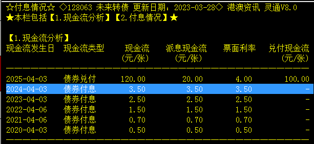 首先我们看到未来转债是120元的到期赎回价,其次我们可以查到4月2日晚上会派息3.5元(个人扣20%税机构公司账户不扣税)等于个人账户持有一年保底是122.8元左右,(深圳的可转债到期赎回扣税是当年利息部分的20%,机构和公司账户不扣税所以机构公司账户保底123.5元。)