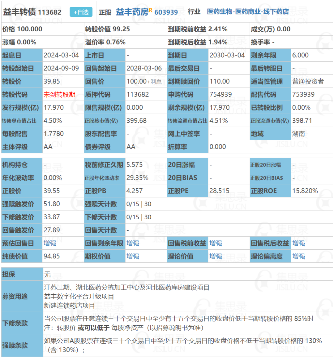 益丰药房周五收盘价39.55,转股价39.85,转股价值=转债面值/转股价*正股价=100/39.85*39.55=99.25,转股价值一般,可转债转股价值越高越好。
