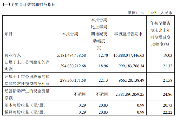 2023年第三季度公司营业收入同比增长19.03%,归属上市公司股东的净利润同比增长21.32%。