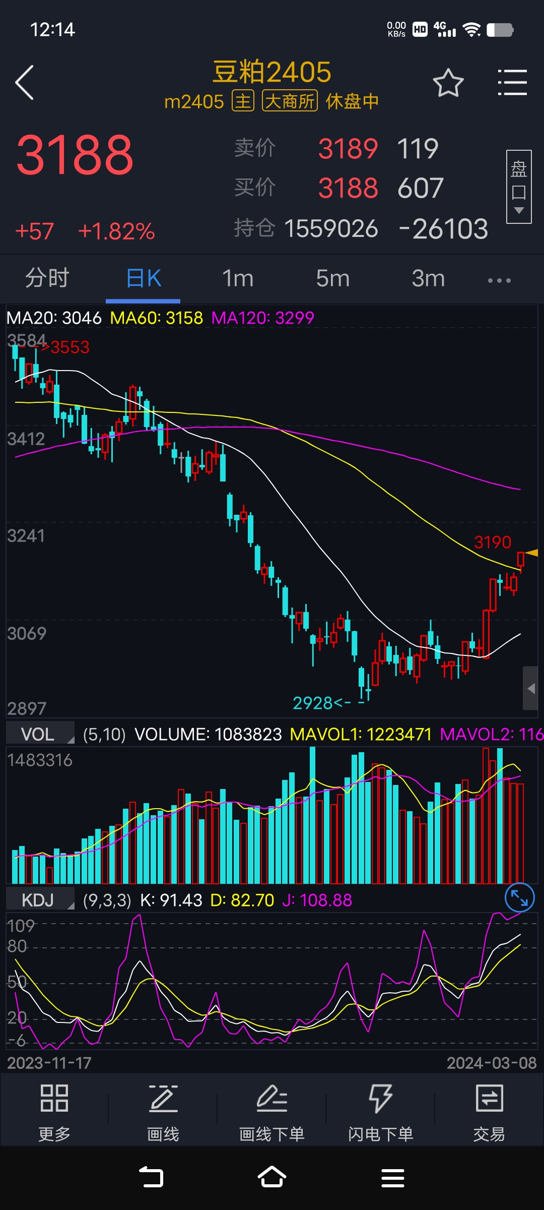 预测不重要,主要是如何应对,我认为至少不会大跌,不会跌破前低2928,用卖虚沽赚的钱来做为买购的成本。如果预测不重要,主要是如何应对的话,想要十倍不是必须豆粕吧,豆油螺纹等其他品种不是也可以?