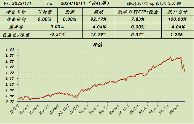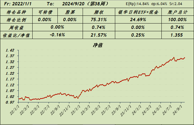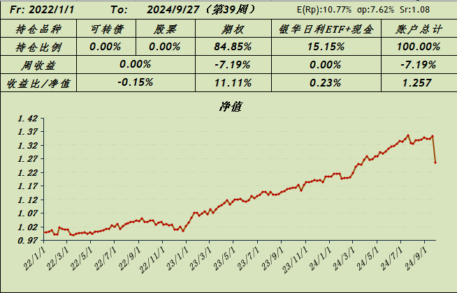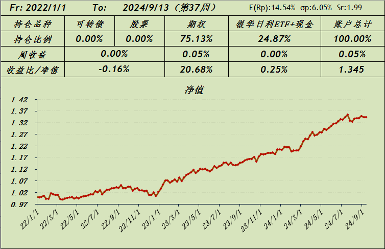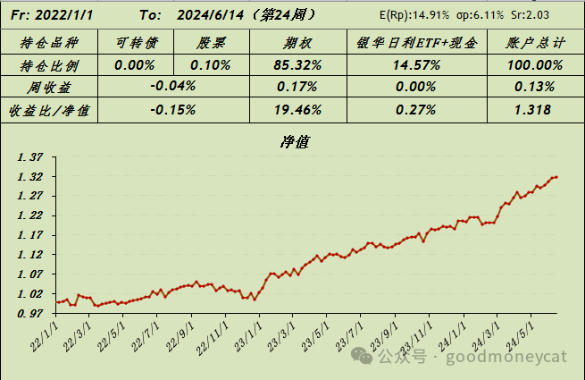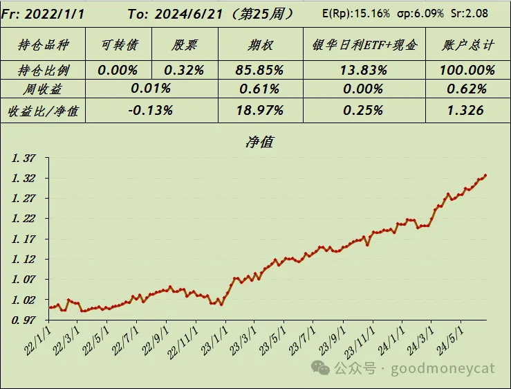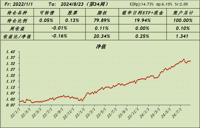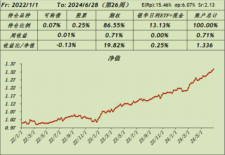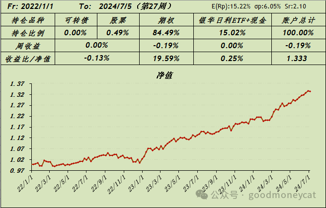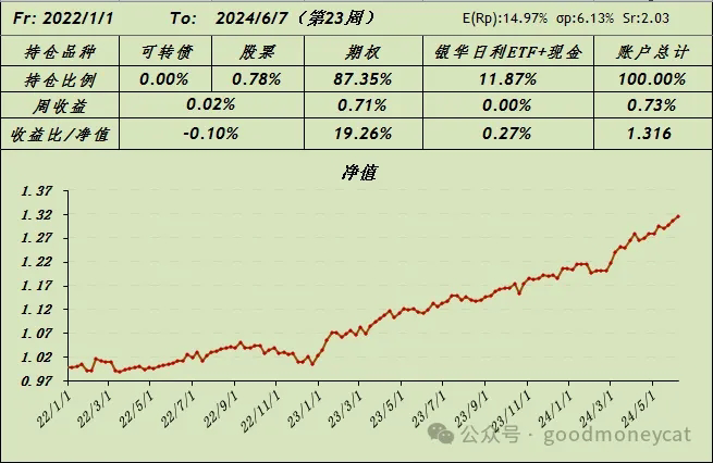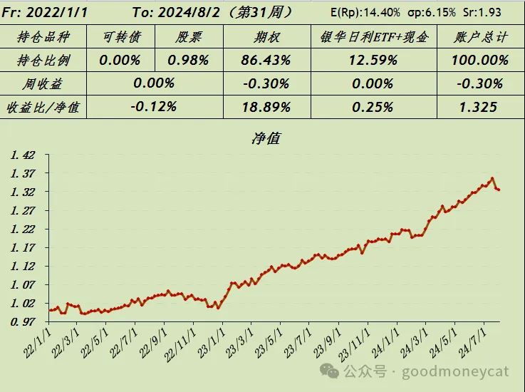 本周-1.92%,刷新了实盘记录以来的单周最大亏损比例,仅次于2022/3/11俄乌战争打响的那一周,单周亏损金额同样创下新高。这里面有标的行情走势的原因,另外50/300ETF期权权利金近期一直处于偏低水平,以及第28周又因为其他缘故临时增加了大约25%的仓位所致。如果后续几个月年化波动能控制在6.5%以内,那么目前的持仓结构期间就不再另作调整,以期望凭借更多风险敞口获得更高的理论收益。
