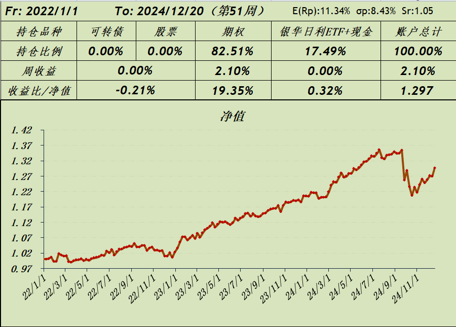 2024年是市场极限拉扯的一年,年初中小股指崩溃,国庆前后多种因素叠加,却又促成了一波的非典型“牛市”。以上证50为例,当年ETF波动振幅在40%左右,而如此大幅度的波动冲击,被市场外有形之手挤压进了10个交易日内,夸张程度令人叹为观止。50ETF波动率指数,年头和年尾大致相当,前三季度伴随市场流动性慢衰竭,波指每况愈下,期权义务方低波下获利空间有限。九月底十月初的行情暴起,又使得很多中性策略遭到重创,对于卖方而已是非常艰难的一年。今年账户净值由年初的1.206升至1.319,中途资金大额进出统计或有出入。2024年实际收益率约为7.1%,年内最大回撤约11.24%。Happy New Year!