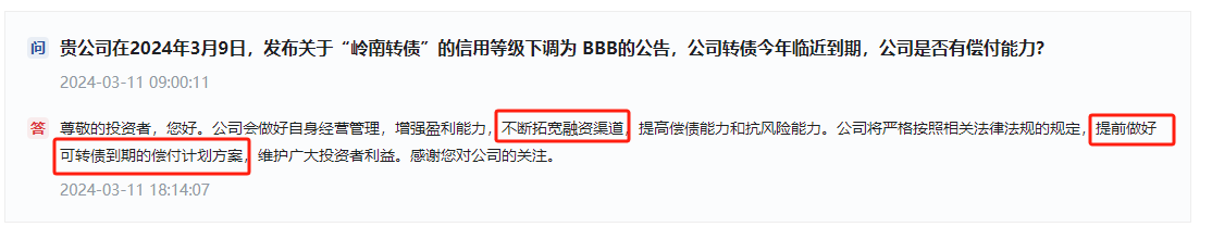 我其实想说的是“最终不会违约”和“市场认为你会违约而引发下跌”是同时存在的。我个人认为岭南这属于收益和风险都有债。这种博弈的实际上不属于较低风险的范畴,所以我不参与。