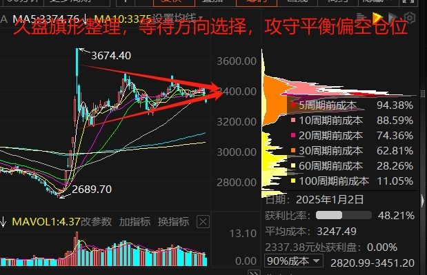 以我的交易心得,普通人很难在市场持续获利的。今天高开高开高走,本来开盘不跌反而涨就知道今天行情会好,为什么今天会看好,很简单,外围很差,早盘该跌不跌。甚至高开,又有昨天大跌为基础。我的交易经验和习惯在应对市场情绪化的时候总是很难把握。这一点要改进。回到今天,上午错大了,交易习惯还是逢高抛出,加上昨天也加仓有筹码,然后就悲剧了,越卖越涨。现在不敢卖出了。希望能回收些筹码。 大盘筹码已经形成单峰密集了,去年国庆以来大部分成本都在3200-3400一线,套牢盘也少。上涨压力变小。盘整就是蓄势。‘我很少主动大量买进。大部分情况下是被动补仓的。首先大盘持续强势,我的交易习惯会顺势把仓位加上去。事实上小账户是持续增仓状态的。这是长期交易形成的思维习惯。
