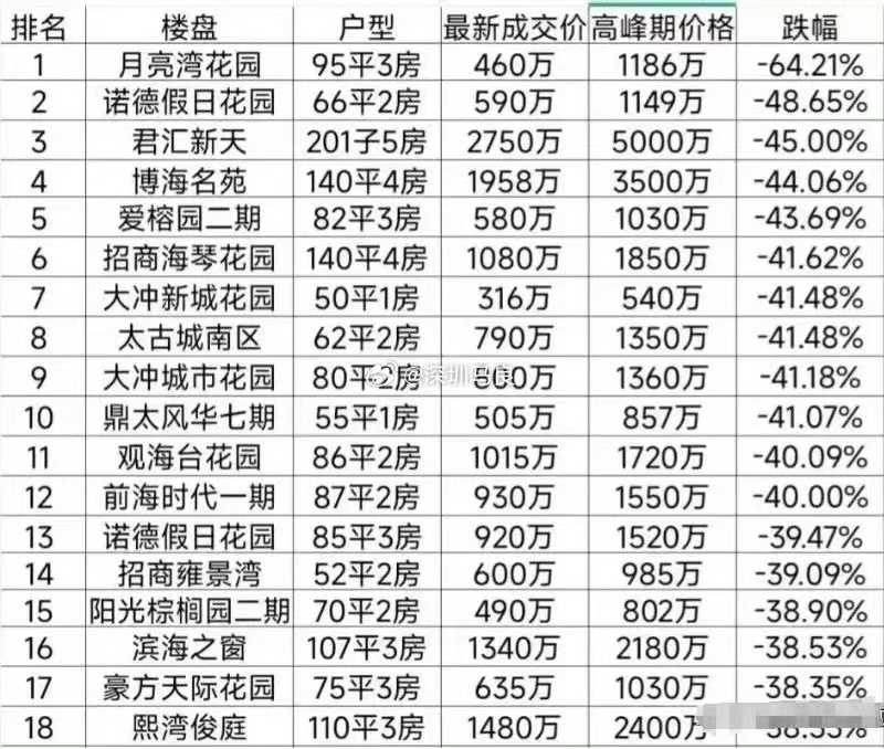 高峰期价格有几个是真实价格?还不是这帮人自买自卖价格这你就不了解情况了,榜单上很多盘都是深房理当时操控的,它怎么玩的你自己搜一下吧,老多新生韭菜挂树枝上啦!这还只是南山哦,宝中玩的更嗨了。可以这么说,深圳80%的盘只看价格已经回到19年,算上所有成本回到16年了。