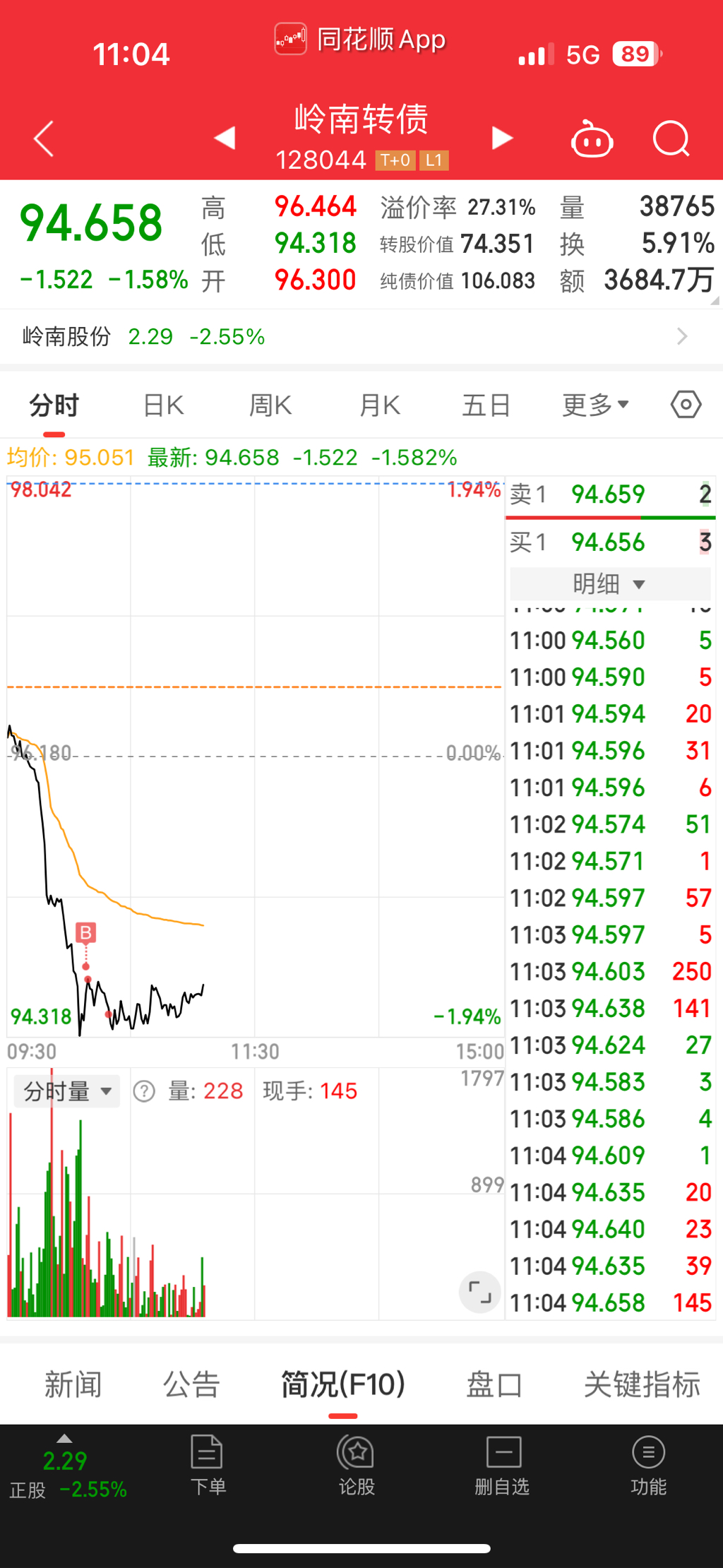 岭南不雷赚10块,雷了剩10块,怎么看都不划算!时间短,雷了翻盘机会都没有,价格低不代表低风险,很多垃圾债属于高风险低收益,另外,建议远离垃圾债,提高认知赚大钱。你有一个基本的判断错误,雷了不是剩10块,因为现在的转股价值有75,假设暴雷后正股三个跌停,至少还剩下50,你硬要说连续20个跌停到10块,那就当我没说