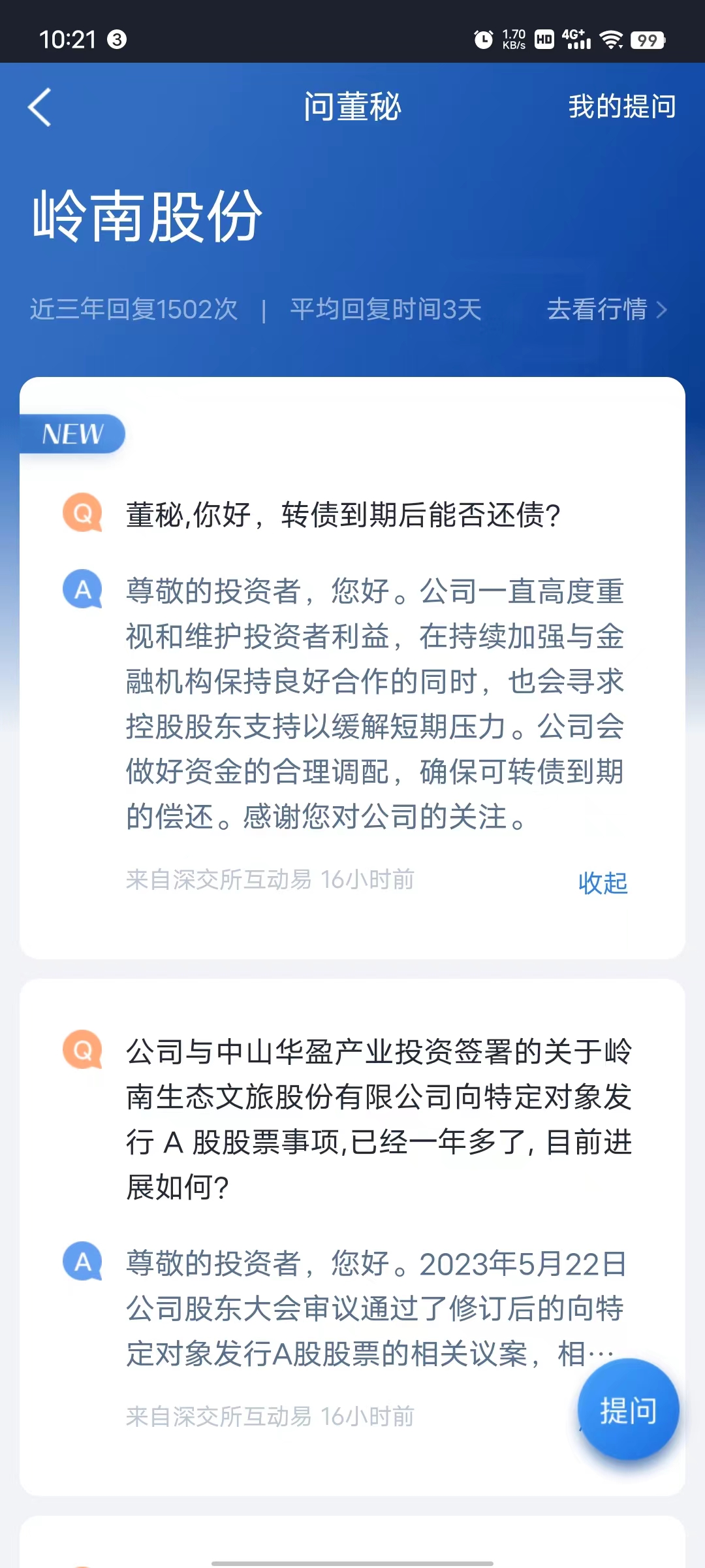 大家都歇一歇吧,告一段落了,剩下就等结果了。暂时都忘了岭南吧,找新的去讨论,没必要,讨论不出什么。风险爱好不一样,我也说了,单纯评估我也不会去买岭南的债,这里唯一的前提是录音,互动易明确了会兑付,我就是相信他而已,相信上市公司,相信国资控制的企业有基本的信用这么简单,没能力去深究。