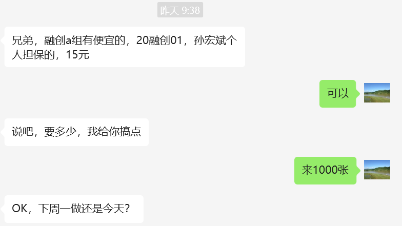 我跟大家说个事, 有网友打过融创 2001(163376)的电话, 在兑付的前几天 说钱已经准备好兑付. 我不放心,又电话确认, 那边的工作人员信誓旦旦的说,资金已经准备好, 可以兑付. 后来在 93 买入 4000 多张, 过两天, 融创发公告不能兑付.假如录音了呢?