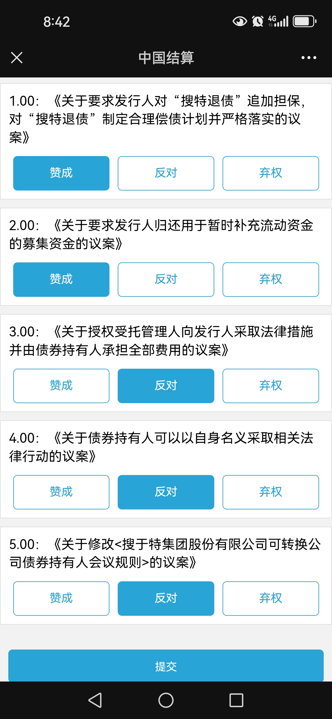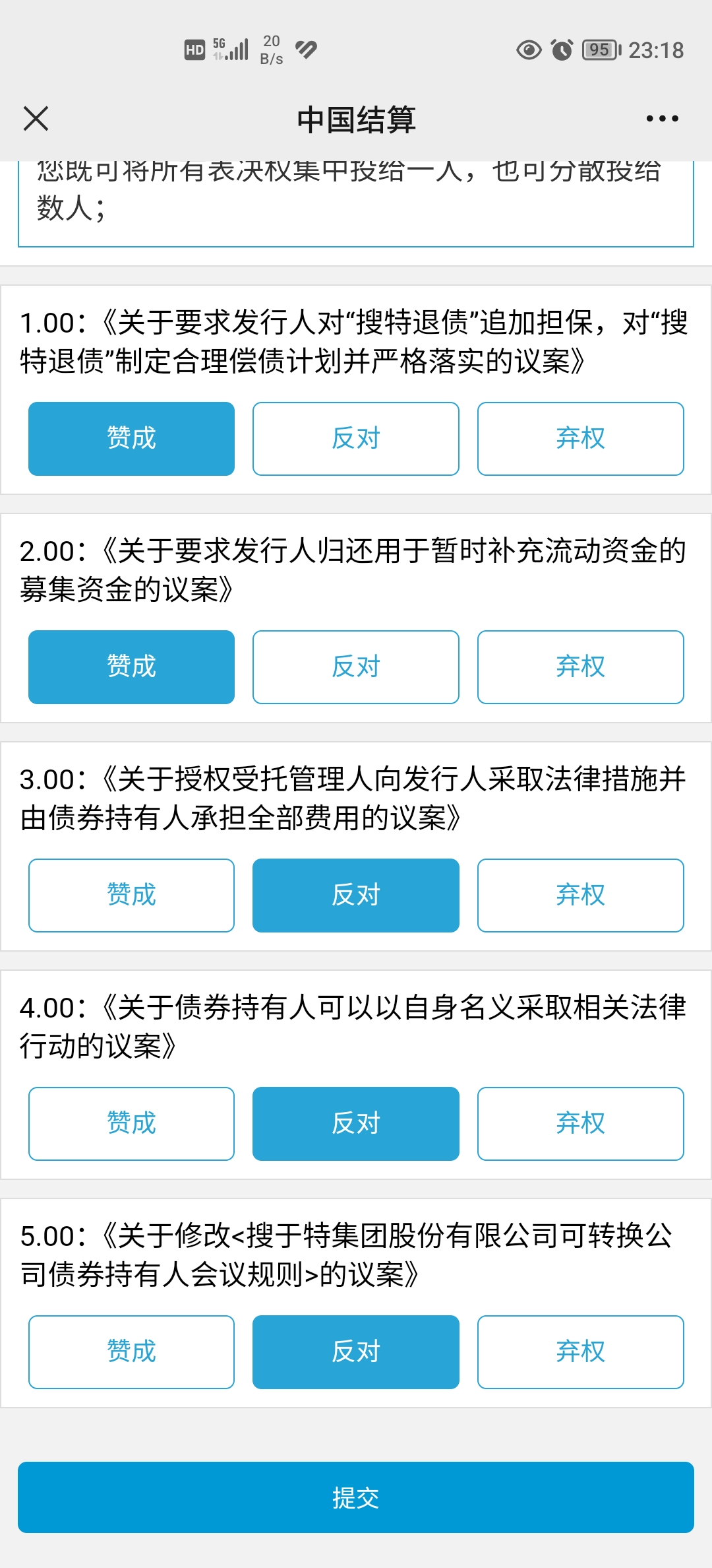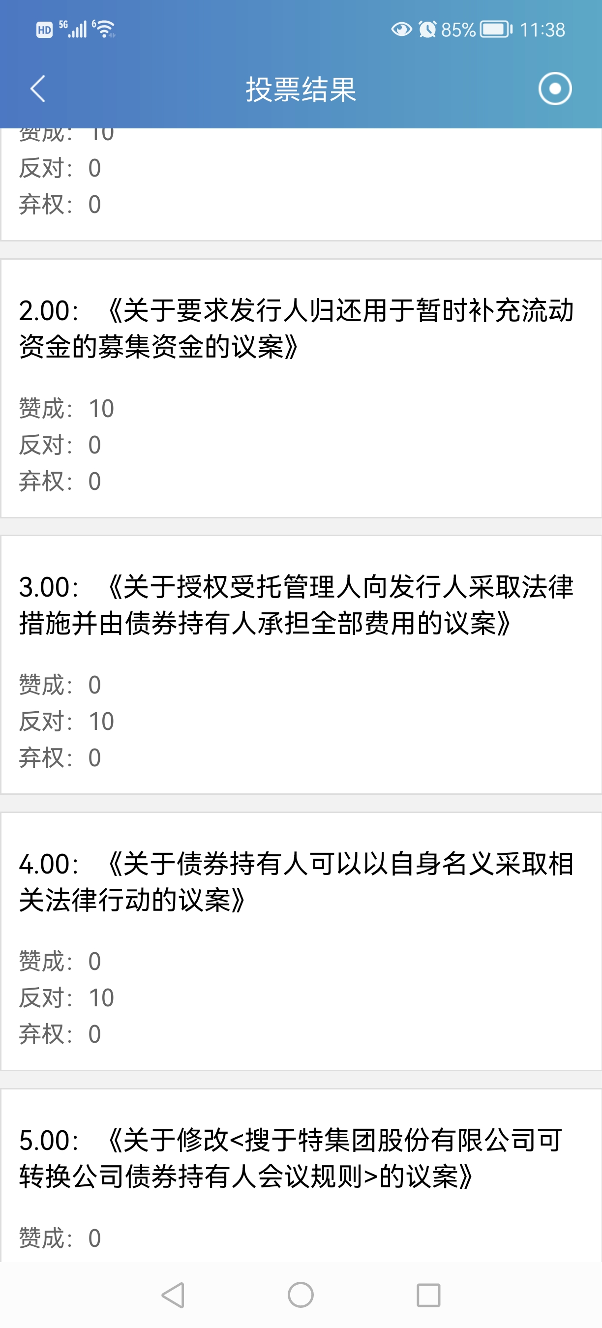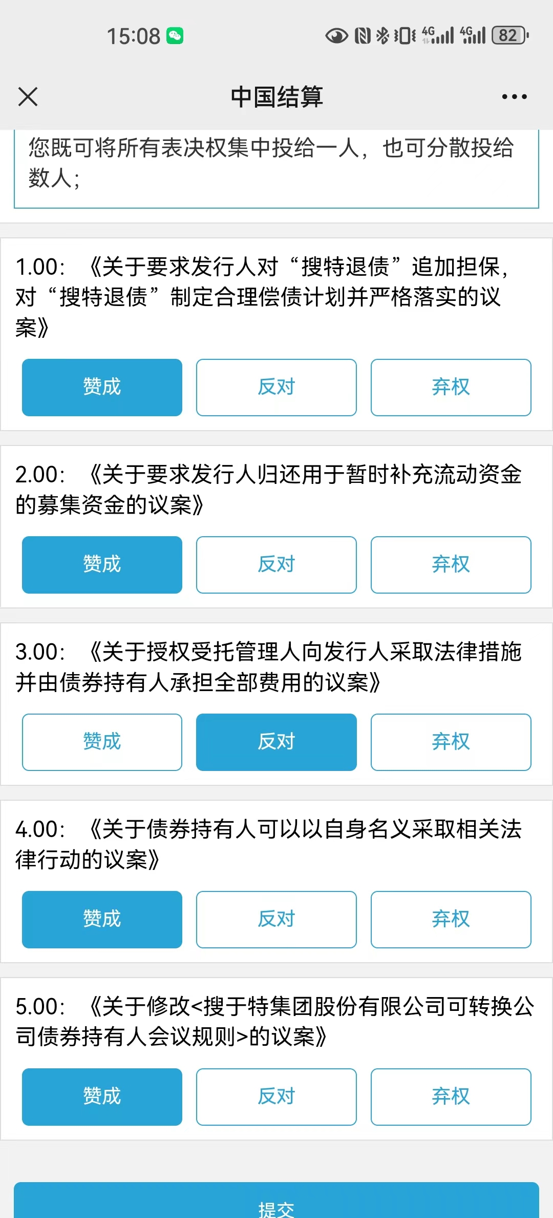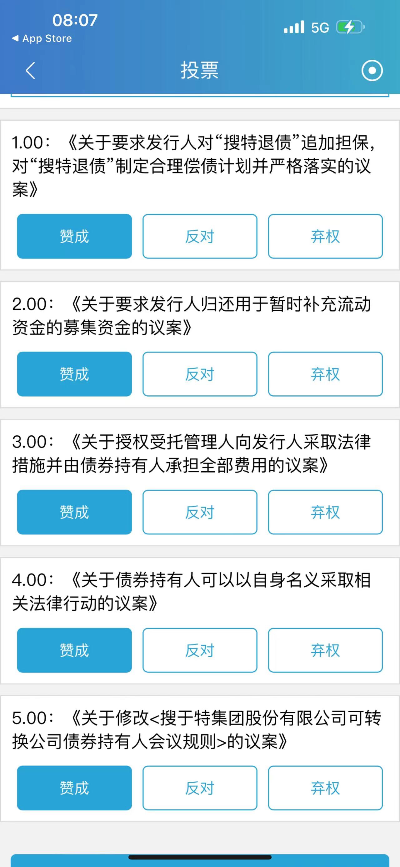 为什么大家都对第四个议案“债券持有人有权以自身名义采取相关法律行动”投反对票呢?授权个别人以自身名义起诉执行,很难说这种个别人能把诉讼弄成什么样子?他们要是取得了不太好的诉讼结果,那就不利于我们后面整体持有人去争取更大权益。 但对此我也没把握,所以该条款我投了弃权票。