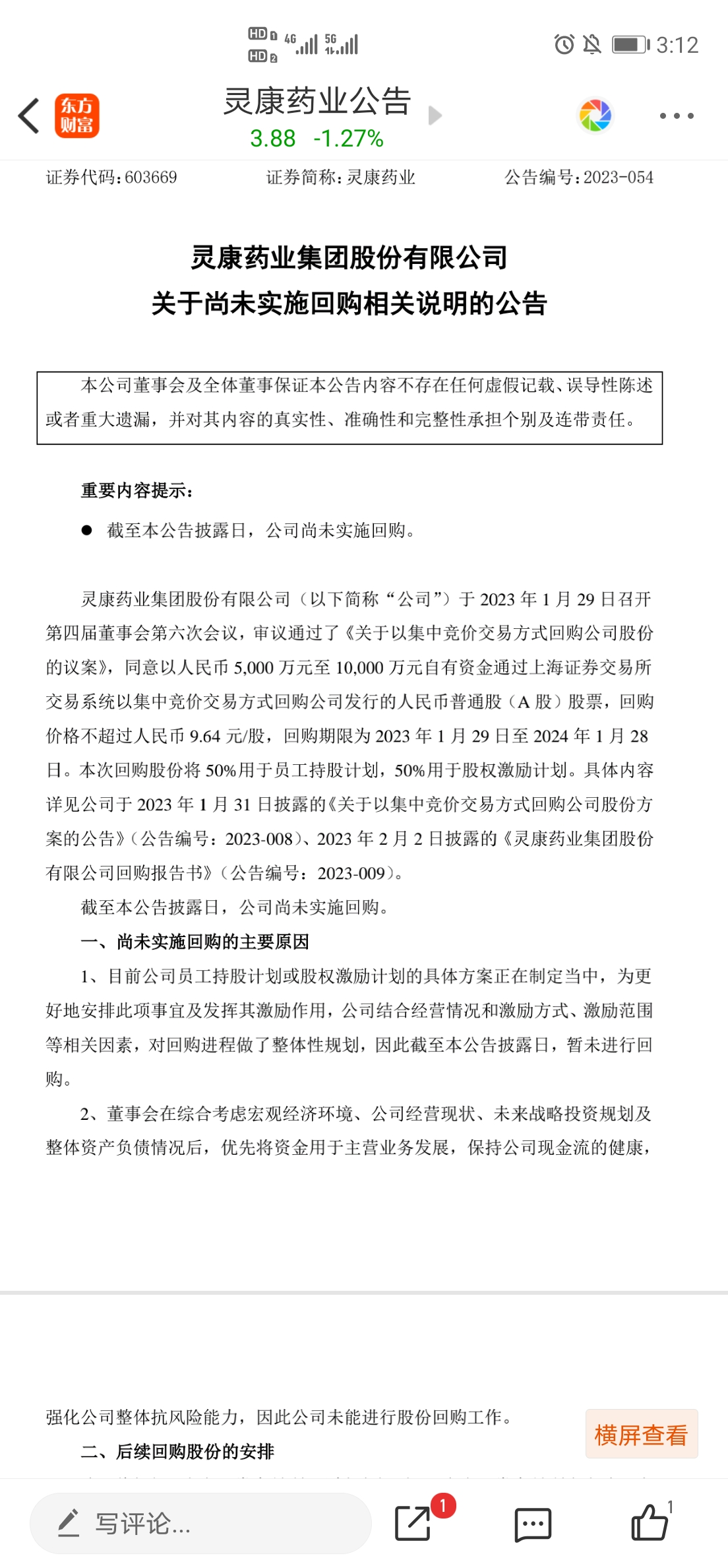 5、2023.11.04公司公告六个月内回购1-1.5亿元,现在只回购了700万元。2024.05.04就到期限了,年报前十个交易日不能回购的,那只能公布年报后,只有26、29、30三个交易日了,猛吃一个亿拉一波?