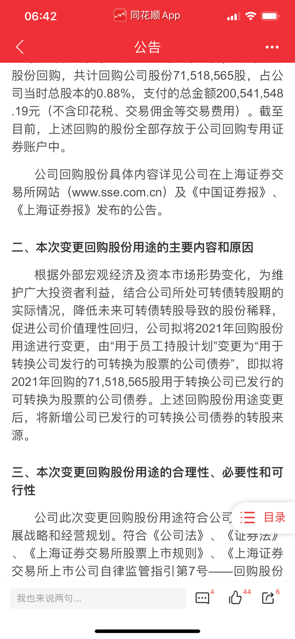 3、2024.03.30公告变更该部分回购股份为可转债转股。但2024.06.26迫在眉睫,转股基本没 有可能。