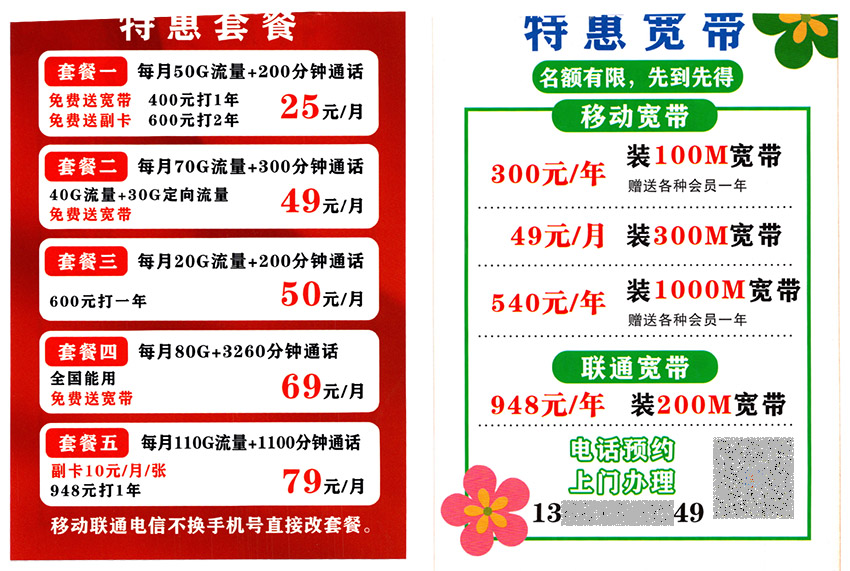 请问楼主,怎么判断那是一张电信诈骗的宣传单页?我也不知道啊,只是猜测,没有证据。300元一年送宽带,还有大流量包和长时间通话,还不用换号。万一是真的,是不是就赚翻了啊?要照这样子分析,太便宜的不能买,天上不会掉馅饼,是吧。可是电信卡或者流量包个人也做不出来,能上网的宽带,一般人也弄不了吧,那肯定和电信公司有关啊。以前买过一次物联卡,开始挺好用,用用就找不到人了,投诉让你找无数的证据,移动联通电信都不承认是它们的卡,可是这种能上网的卡貌似一般公司也做不出来吧。只能想当然认为神仙和妖怪是一伙的。就像股市里的低价股和低价债,万一是错杀呢?