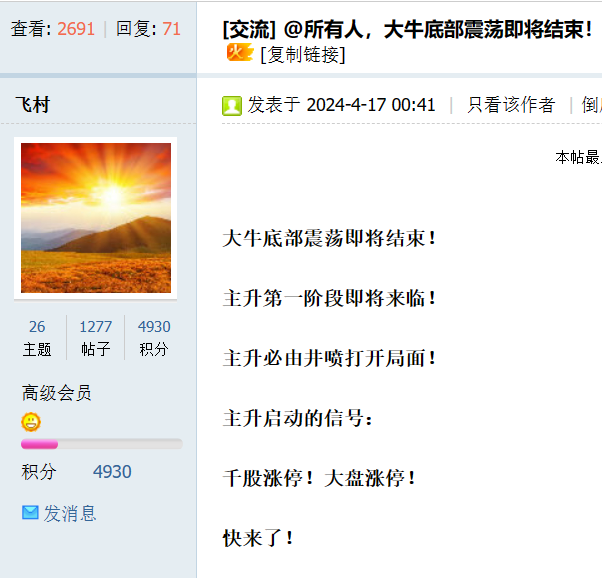 那是我写2023年年终总结的时候说的,2024年要做好指数奔向2500的准备,结果暴跌中证监会主席下课了,新股暂停了,用政策托了上去,只差30多个点就奔二千五区域了,预测的也不算离谱吧。水平很高,与我的想法基本一样,我也是很认同。但现在的结果是我一直持有,并加仓,一直看着ZF出政策,一直被毒打!我的认知是ZF一直出政策刺激,一定会上去的!!结果去年亏5个点,今年也差不多5个点了。而我小舅子就是典型的滑头,越是ZF出的刺激政策,越是相反的操作,结果别人去年赚15个点,今年快20个点了,他前两天给我说的一句话我现在认为可能是对的,越是要刺激的东西越不行,越是限制的东西,越要买。哎,市场先生太难了!!