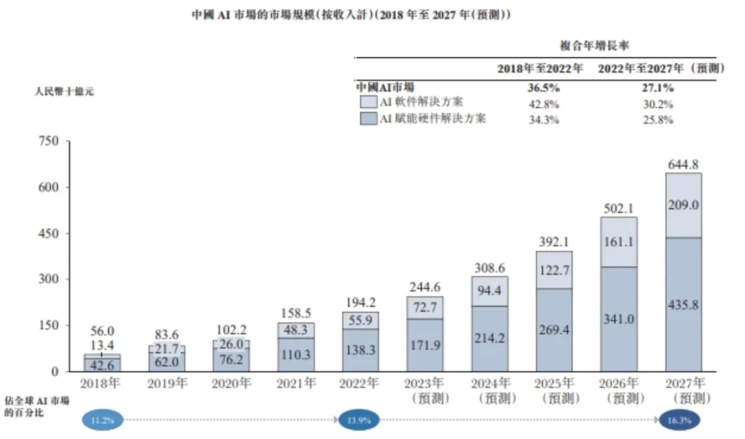 根据灼识咨询的报告,中国AI市场规模(按收入计)已由2018年的人民币560亿元增至2022年的人民币1942亿元,2018年至2022年的复合年增长率为36.5%,预计于2027年将达到人民币6448亿元,2022年至2027年的复合年增长率为27.1%。