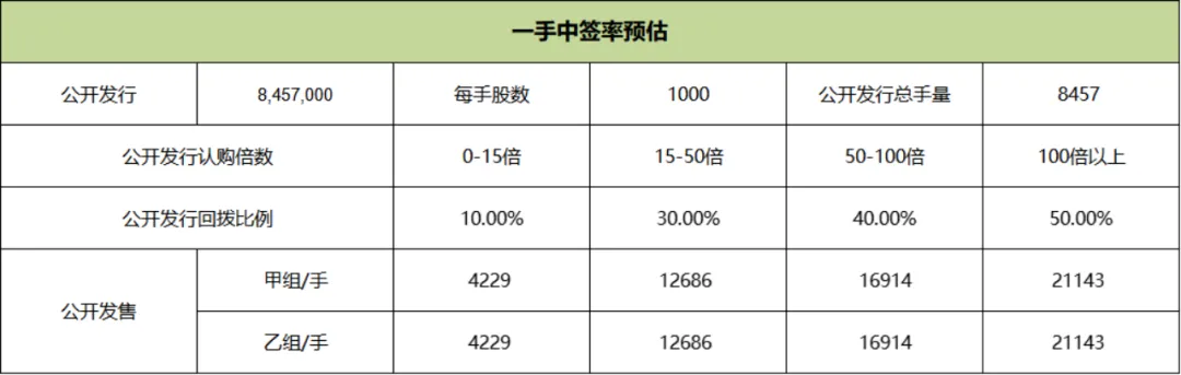 公开发行总计845.7万股,每手1000股,公开发行总计8457手,当前超购 28倍,假设5000人申购,一手中签率100%。