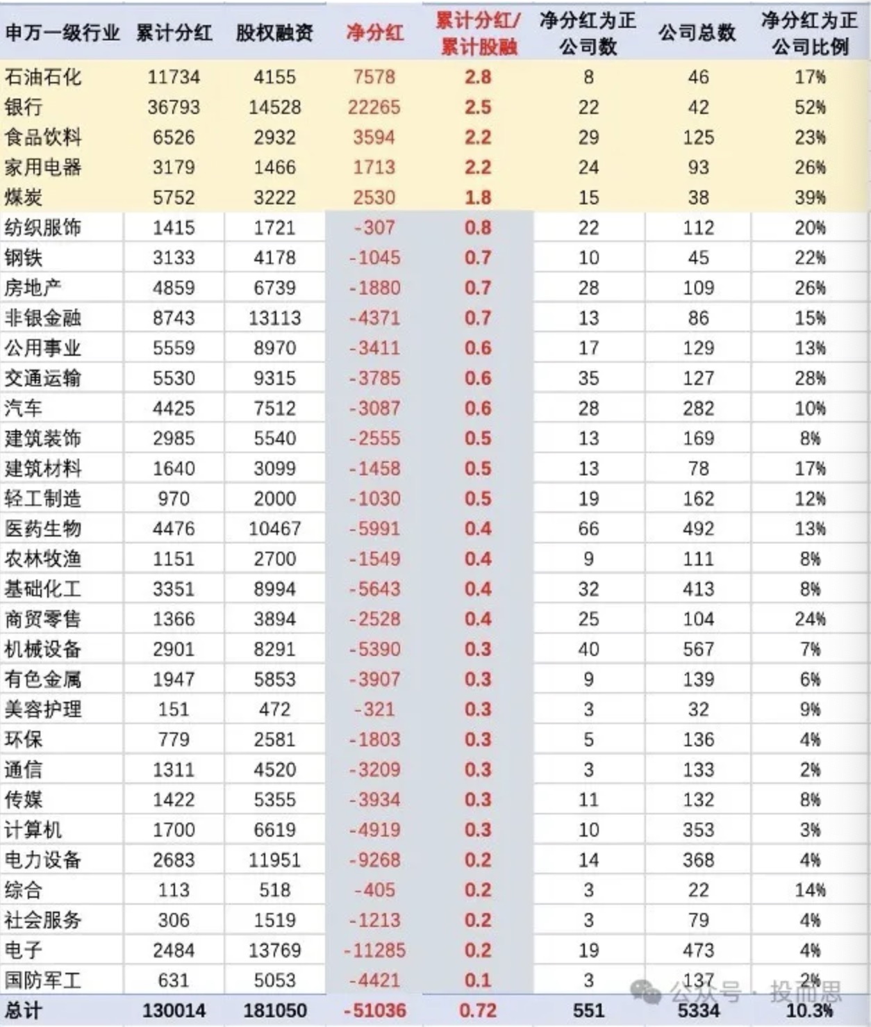在131申万二级行业统计,仅有15个行业的净分红额为正:白酒(天纵英才)> 白色家电(聪慧且努力)> 炼化及贸易(有矿有背景)> 国有大型银行(背景强大)> 保险 (家有背景)。