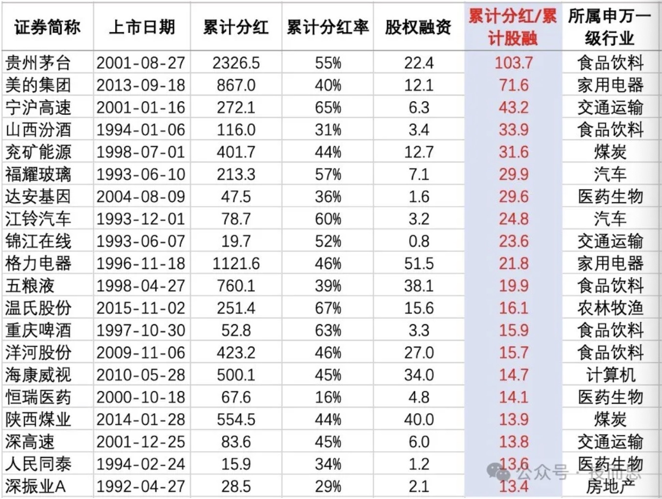股息是长期股票投资收益的决定性因素。今年以来,监管机构强调建设“以投资者为本的资本市场,鼓励上市公司分红,提高投资者的收益。本月出台的“国九条”鼓励现金分红,引导合理、定期分红,对多年未分红或分红比例偏低的公司,限制大股东减持、实施风险警示。净分红为正表明上市公司历年分给股东的钱比从市场上拿到的钱多。按“累计分红/累计股权融资”指标排名,前三家分司分别是贵州茅台、美的集团、宁沪高速。贵州茅台累计股权融资是22.4亿元,累计分红高达2326.亿元,即每从市场上拿1元钱,分给市场103.7元。随着时间的推移,贵州茅台的利润还会创新高,每年的分红也会持续增加,股东们继续开心的收钱。时间是优秀公司的朋友,以合理的价格持有伟大的公司,可以愉快地享受复利带来的财富。