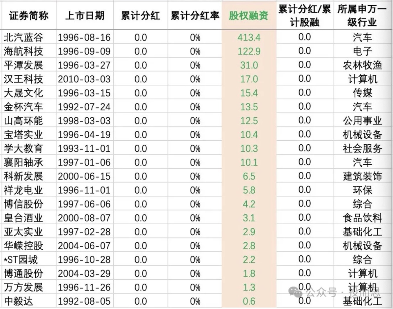 2)某家上市公司多年来很多高科技概念,元宇宙概念、无人驾驶概念、人工智能概念、大模型概念等等高大上的科技。但上市十几年来几乎保持两年增发一次,总分红金额不到股权融次的20%。这种股票再诱惑也需要避免。