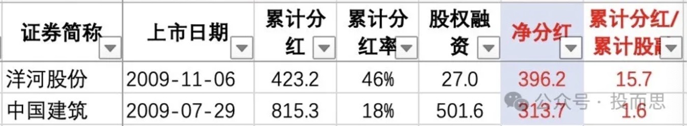 本人加仓洋河其实是换股操作,将低估值高股息的打新门票股中国建筑换成洋河股份。近两年房地产公司纷纷暴雷后,我感觉中国建筑风险增大。按照我自己预计的分红金额除以上周四的股价,中国建筑和洋河股份的股息率分别为5.13%和4.32%,尽管洋河股份的股息率低一些,但洋河股份没有“有息负债”,而中国建筑的“长期负债”高达4581亿,五年间增长113%,是总市值的两倍多。所以尽管中国建筑2024年预期的市盈率只有3.8倍,但能分红金额占净利润的比例不多,公司的可用和自由现金流并不多。洋河股份的财务则健康得多,4.32%的股息也远高于银行理财,有息负债为0也是非常健康。我之前统计的“累计分红/累计股权融资”(截止到2023年底)也显示,洋河股份该比例高达15.7倍,远高于中国建筑的1.7倍。白酒行业的“累计分红/累计股权融资“在申万二级行业中排名第一,商业模式极佳,该指标排名前五的白酒公司分别是:贵州茅台(103.7)、山西汾酒(33.9)、五粮液(19.9)、洋河股份(15.7)、沪州老窖(8.5)。