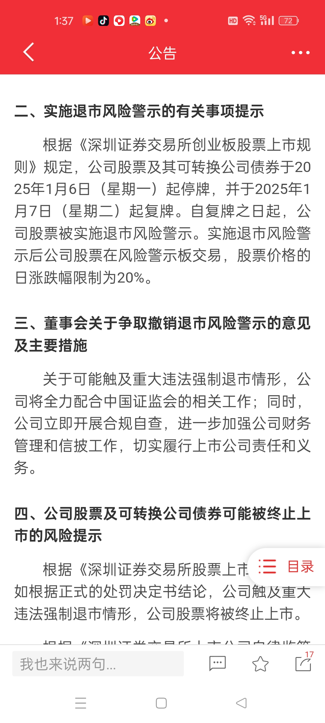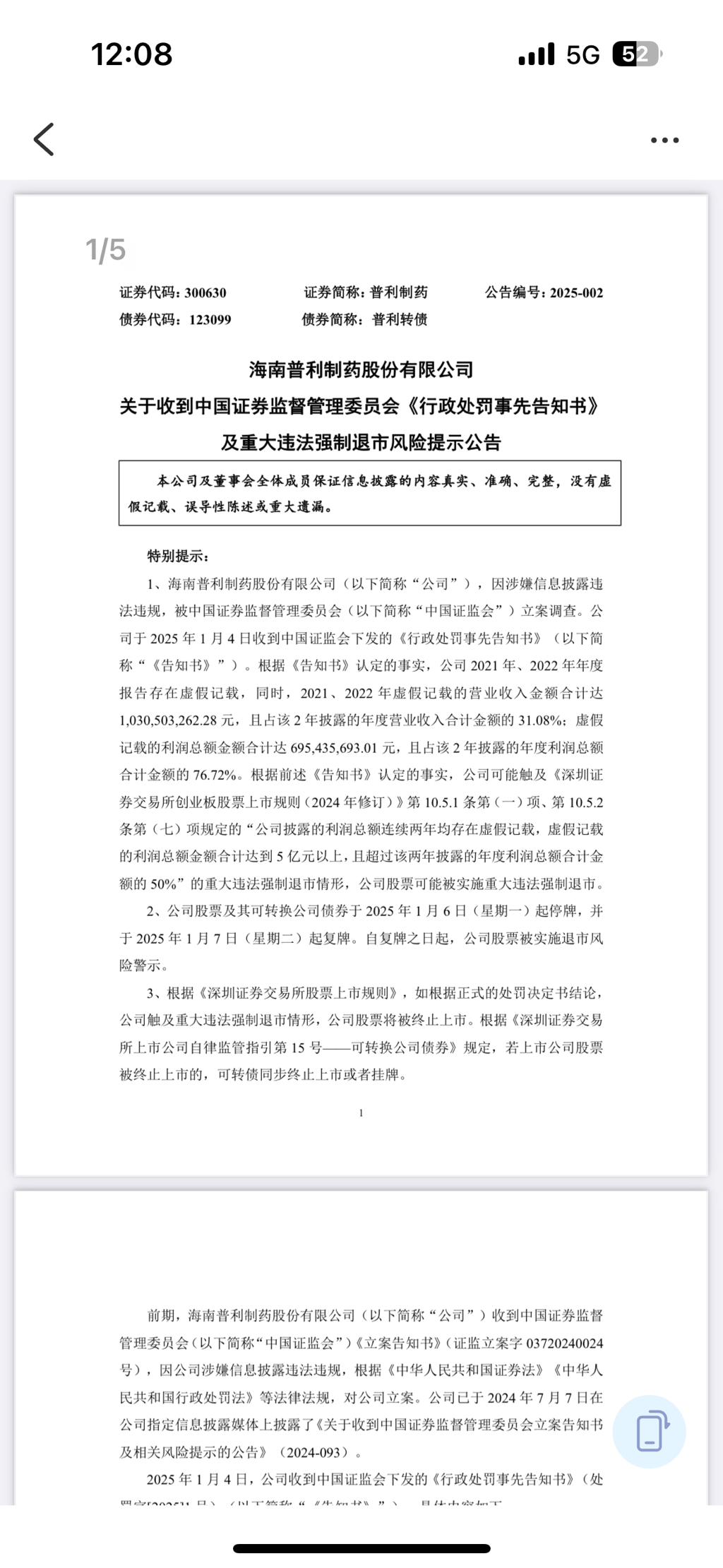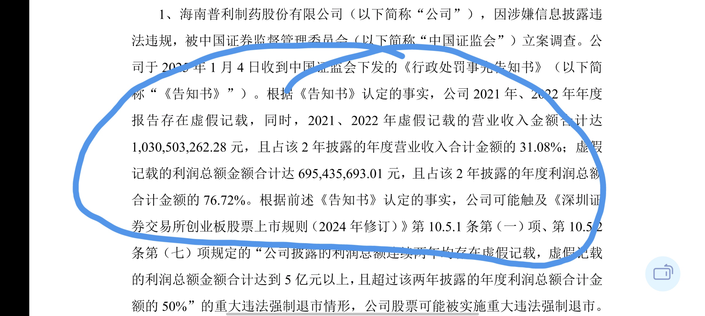 公告已经明确指出了违反了哪一条哪一款了,不用心存侥幸,百分百退市了。如果拿的是可转债,还稍微好一点,毕竟1月22日公布转股价。假设到1月22日这中间连续跌停,那么股价去到0.75元,市值去到3.4亿,普利无论如何也要值这个价吧?