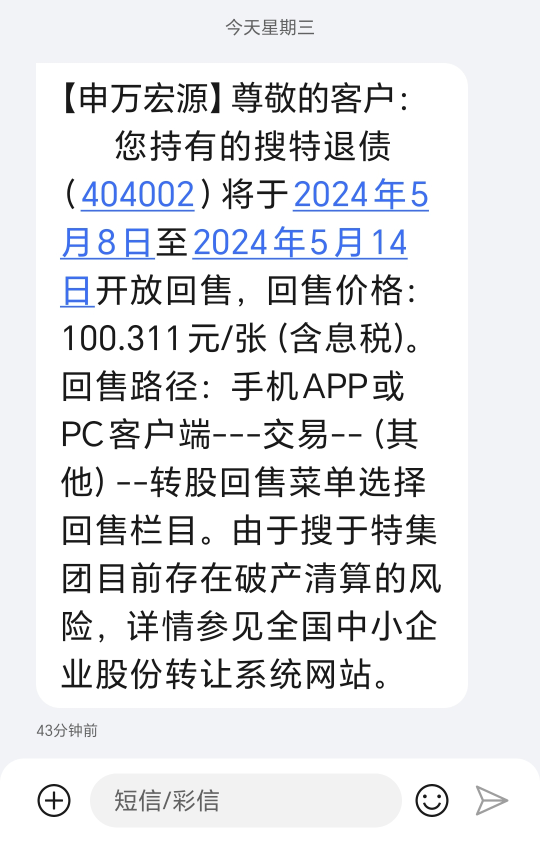 今天收到券商的通知,搜特退债居然回售了,正好把留的10张申请一下回售,没有经历过,不知道后面会是一个怎样的情况?有大佬科普一下吗?