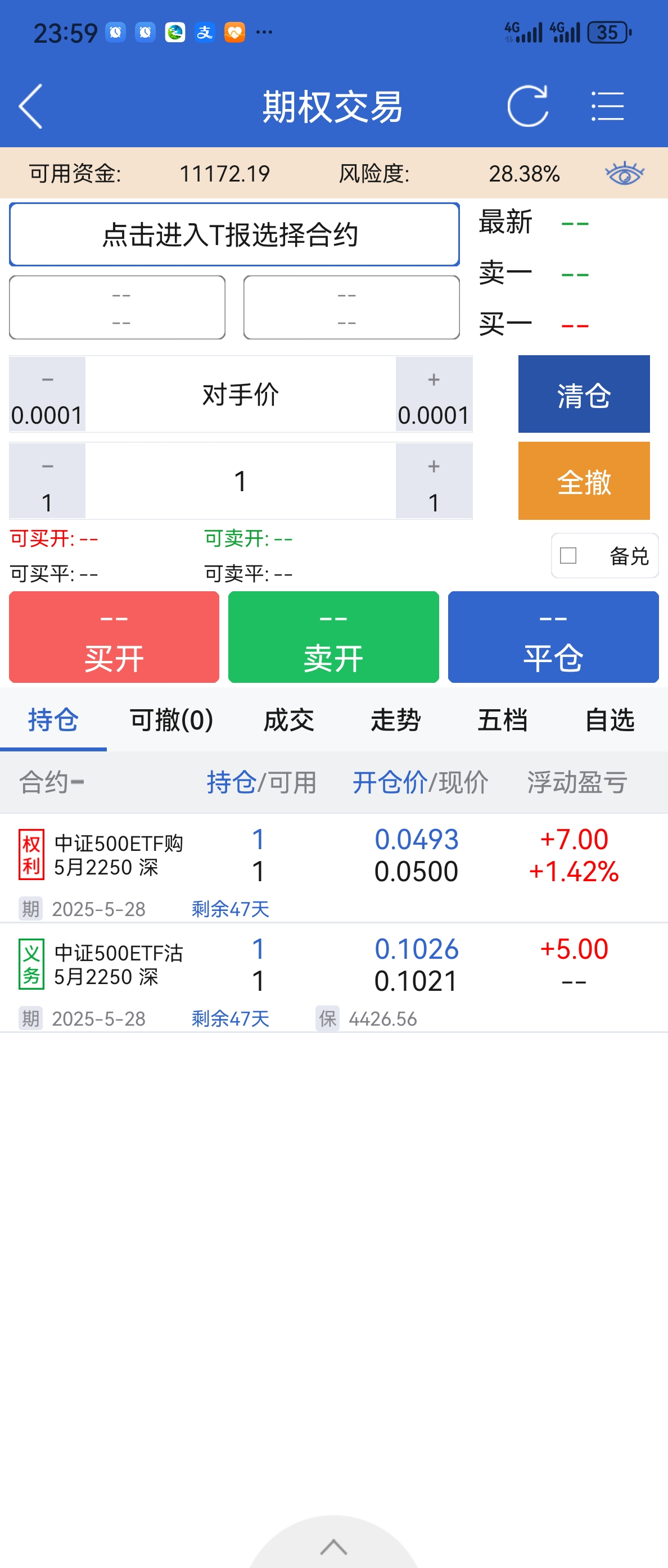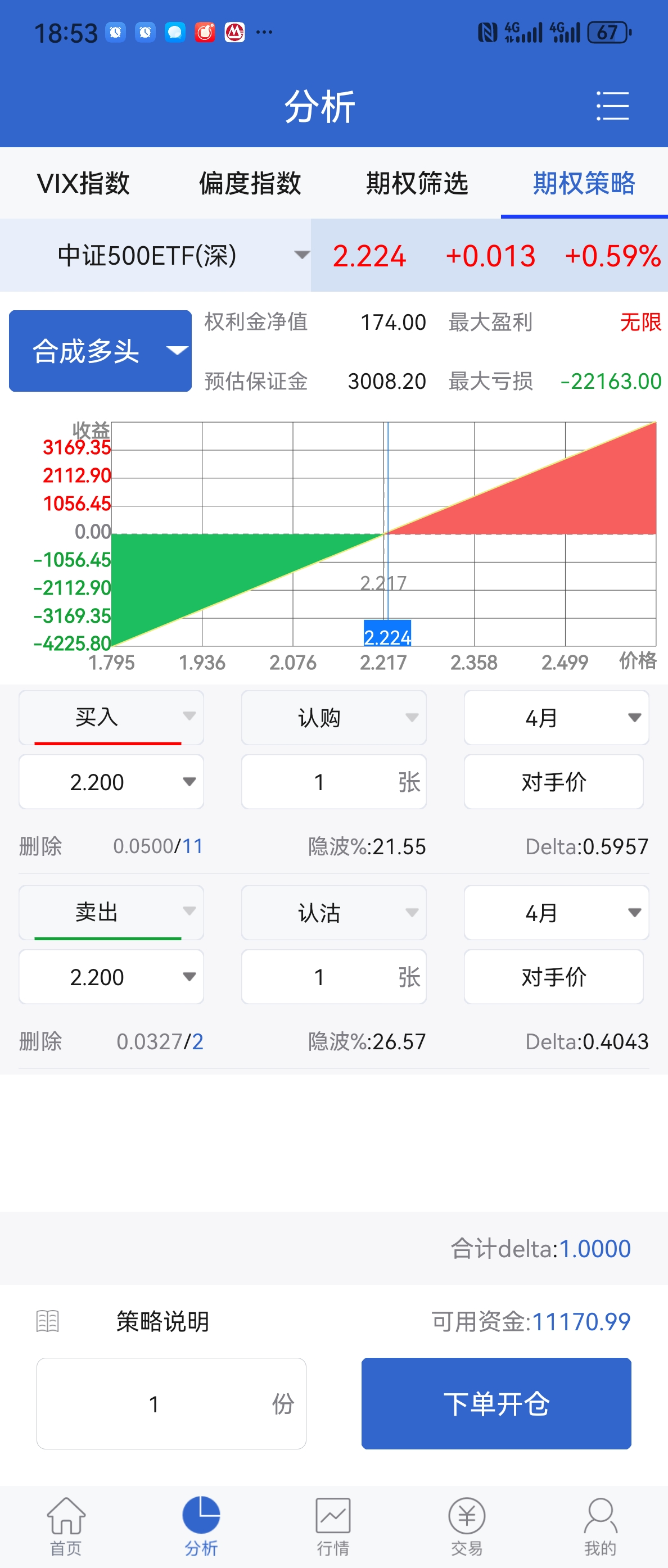 后面还是因为资金不足的原因,没有下定决心操作IM吃贴水,做了一下模拟盘。近期经过一些期权策略的研究,发现利用期权策略合成看多500ETF,也可以获得类似贴水的效果。一手深市500ETF合约市值22000左右,对普通散户比较友好。同时满足贴水和杠杆。本人投入本金15000,实盘尝试一下,定期更新。当前中证500指数 1B0905 点位5581.31账号资产15065.75基金净值 1.0000策略...-p+c=做多期货;p-c=做空期货,这俩公式很常用。