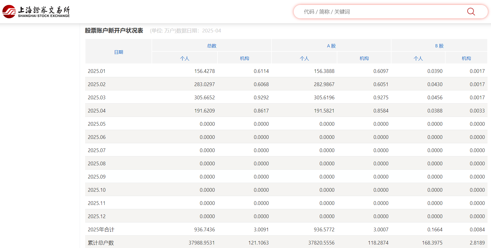 2025年4月,上海交易所个人股票账户新开户191.62万户,同比增加30.58%。与2023年4月相比增加6.42%。